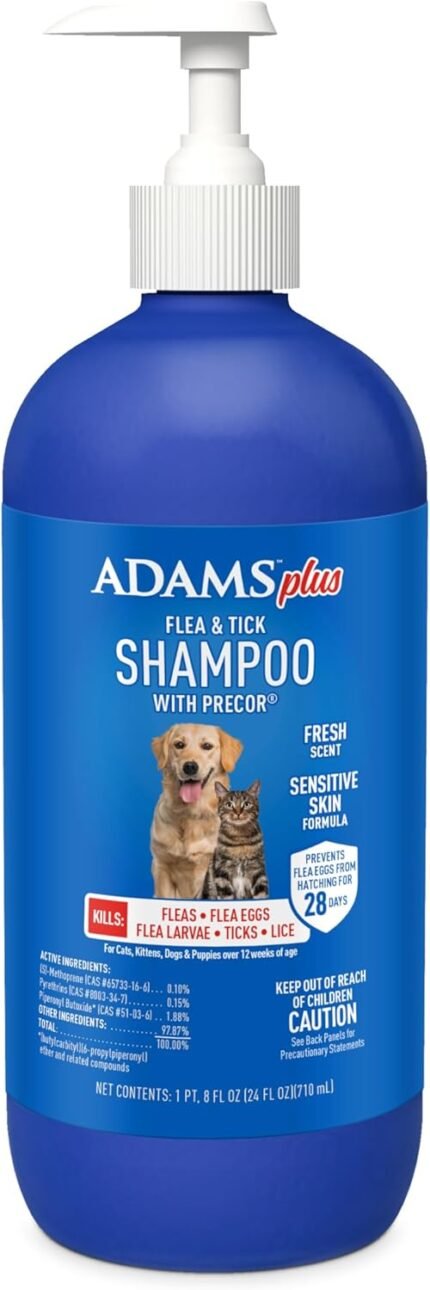 Adams Plus Flea & Tick Shampoo with Precor for Cats, Kittens, Dogs & Puppies Over 12 Weeks Of Age |Sensitive Skin Flea Treatment |Kills Adult Fleas, Flea Eggs, Ticks, and Lice |24 Oz, Pump Included