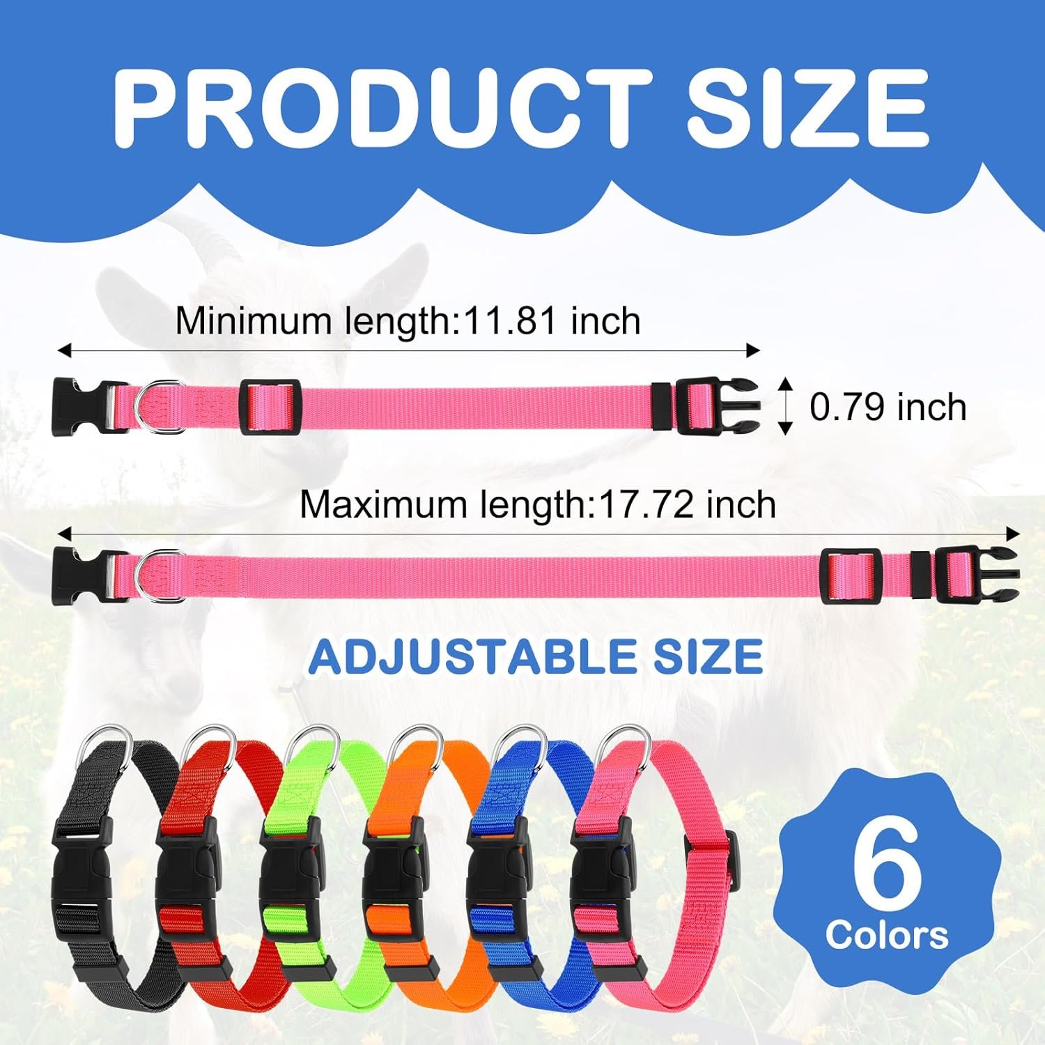 These goat collars are adjustable, with a neck circumference range of 11.81-17.72 inches, and the width is about 0.79 inch. This makes them absolutely ideal for families who have newborn or small farm animals such as cows, lambs, goats, sheep and so on, offering a tailor-made fitting experience for your livestock.