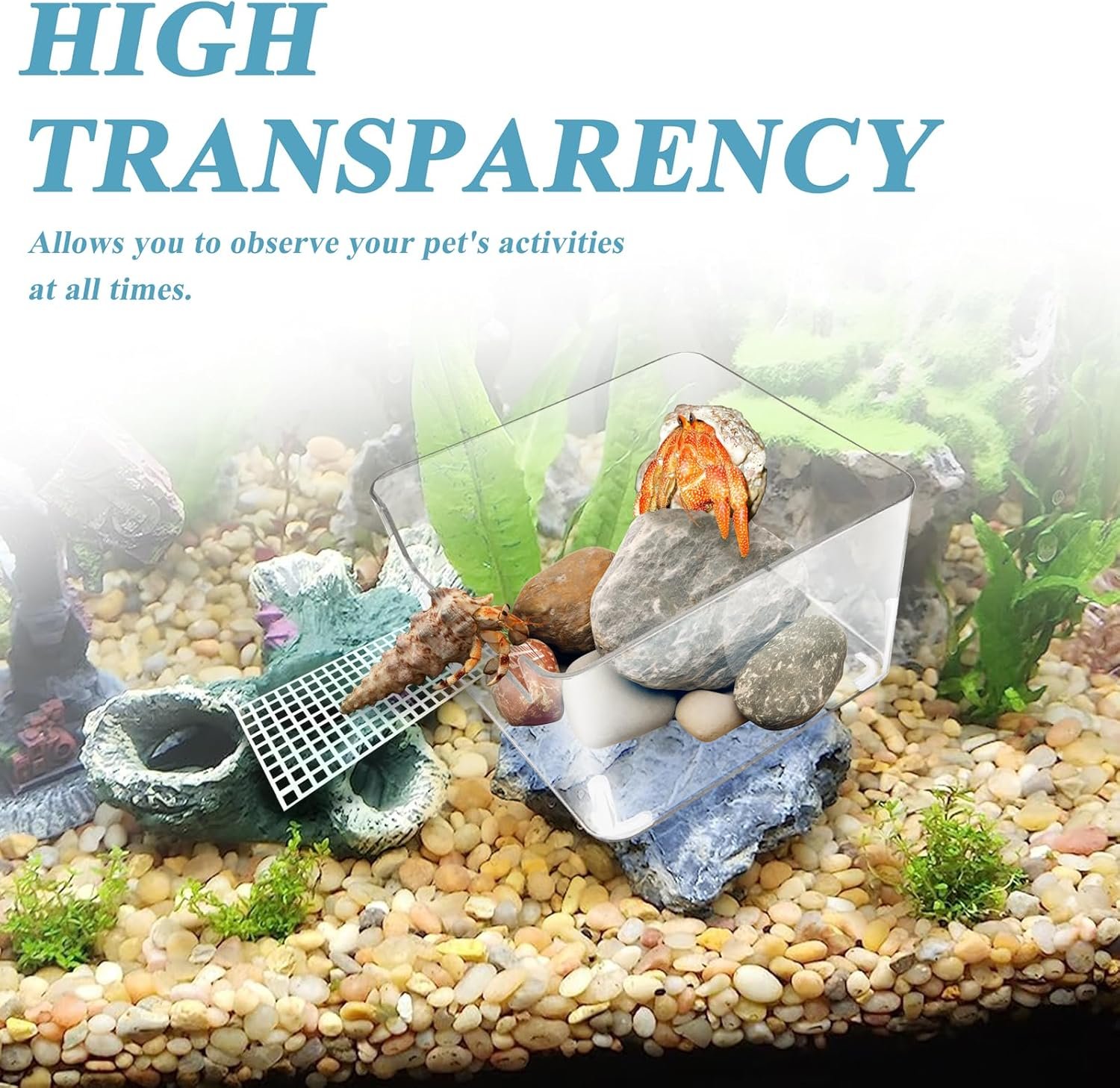 The Hermit Crab Water Tank is a transparent and reliable habitat for your pet hermit crabs. Made of PET plastic, it is sturdy, durable, and safe for your pets, providing a fun and healthy environment for them to thrive in.
