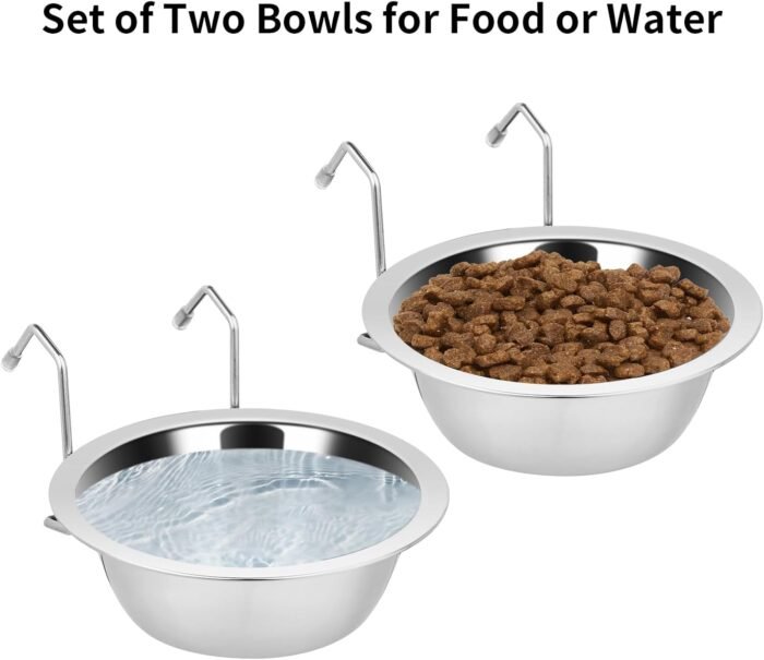 Each dog food bowl holds 8oz/1 cup of food or water, making them suitable for small breeds. The set includes two hanging dog kennel bowls, perfect for serving both food and water or as backup bowls. These make excellent accessories for small and large dog crates, rabbit cages, ferret cages, guinea pig cages, cat cages, or catios.