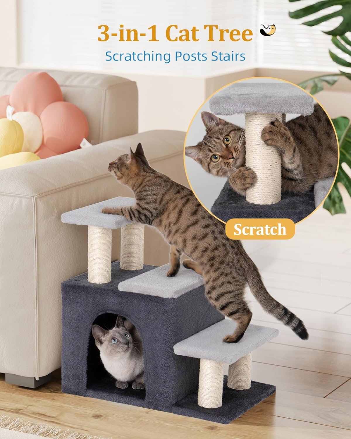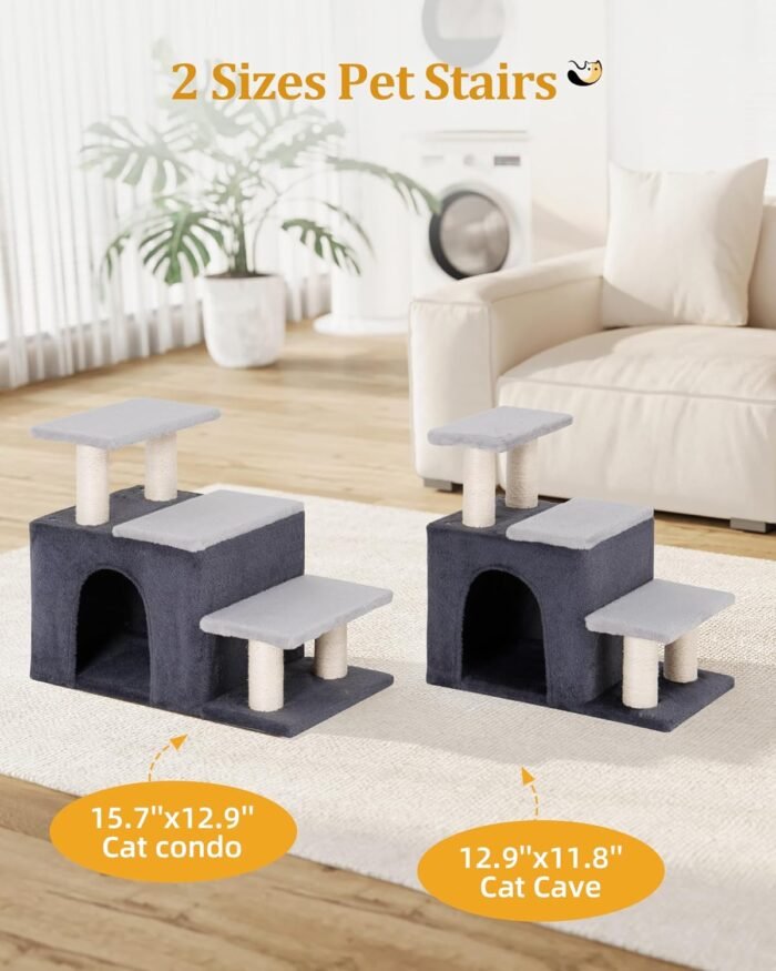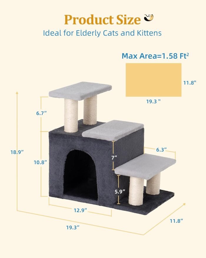Pet Stairs with Cat Condo: This cat tree tower has 3 ladders, a 12.9”x11.8” large cat cave, and scratching posts, which enrich the diversity of cat activities and utilize the space vertically.