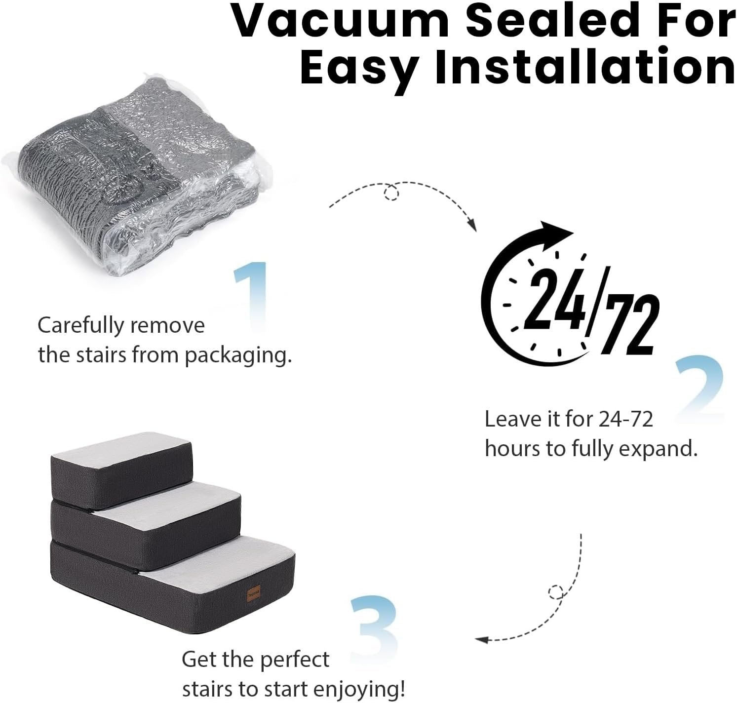 The Garnpet Dog Stairs are a versatile and comfortable solution for pets to climb onto furniture. With adjustable height, these stairs can be stacked to match the height of furniture, shortened to 2-3 steps for low sofas, or extended to 4-5 steps for high beds. It is essential to let the foam expand fully for 72 hours after unboxing to ensure maximum comfort.