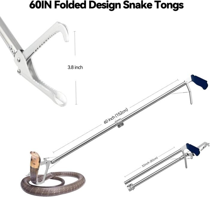 This heavy-duty snake grabber tool combines tongs, catcher, and collapsible pole functions, making it an ideal tool for venomous snake catcher grabber operations or pet reptile care. The 60-inch snake stick with wide jaws ensures safe reptile control, while stainless steel snake handling tools feature non-slip grips. The tool includes snake hooks and grabbers for camping and fishing, and is compact for transport.