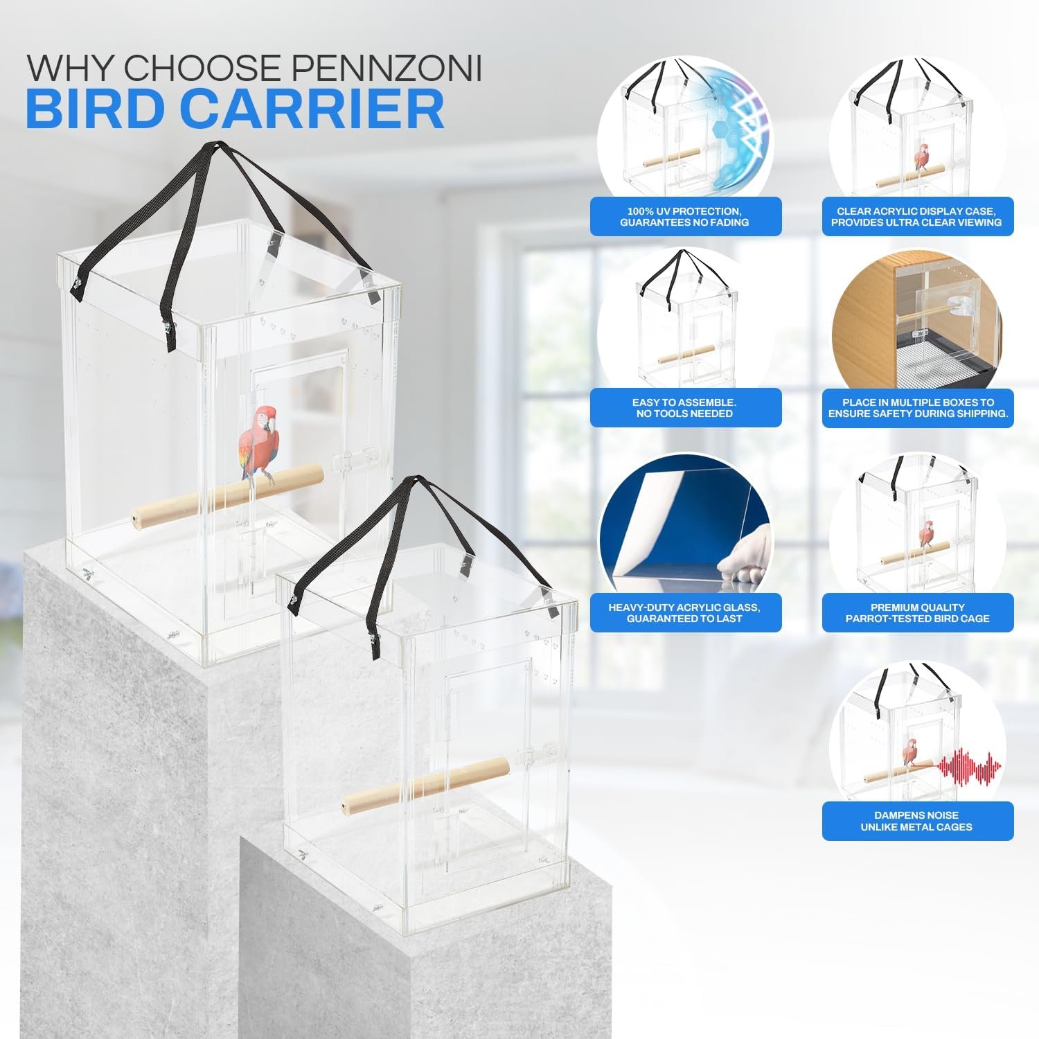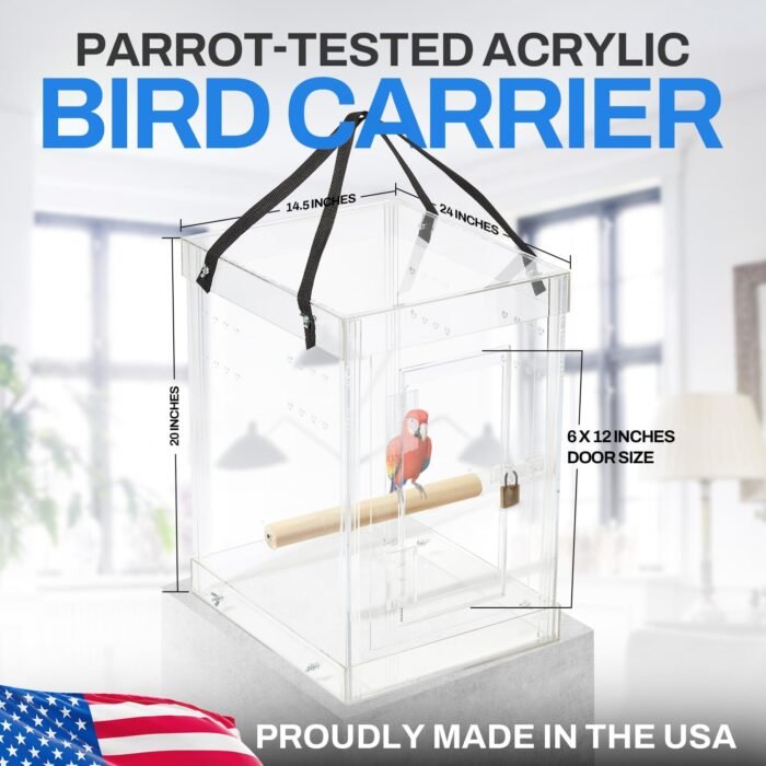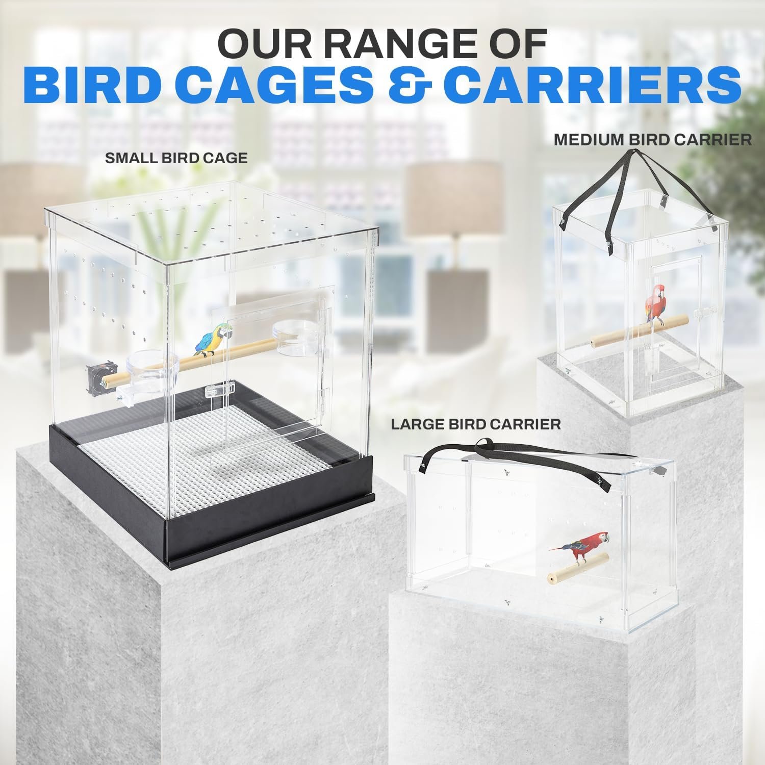 Our premium quality bird cage is a USA-made acrylic bird carrier, ideal for medium-sized birds. The clear acrylic box cube display comes with ventilation holes, a hardwood perch, and a handle for easy transportation. The dimensions of the cage are 14.5" x 13" x 20" with a 6×12" door.
