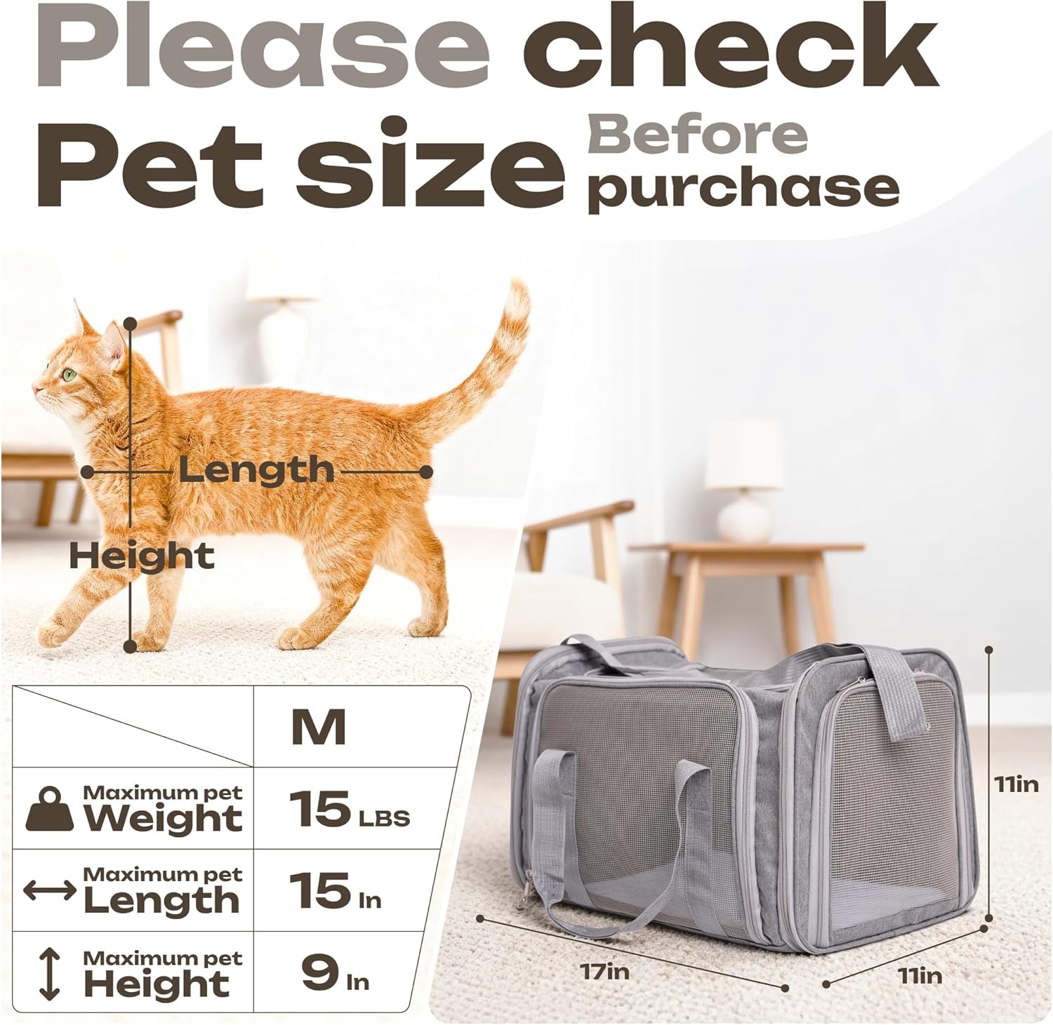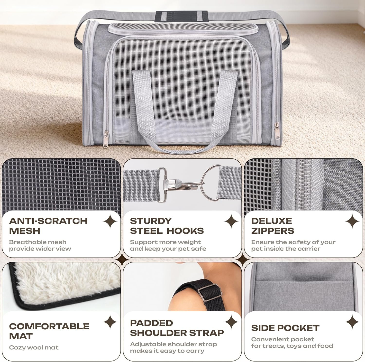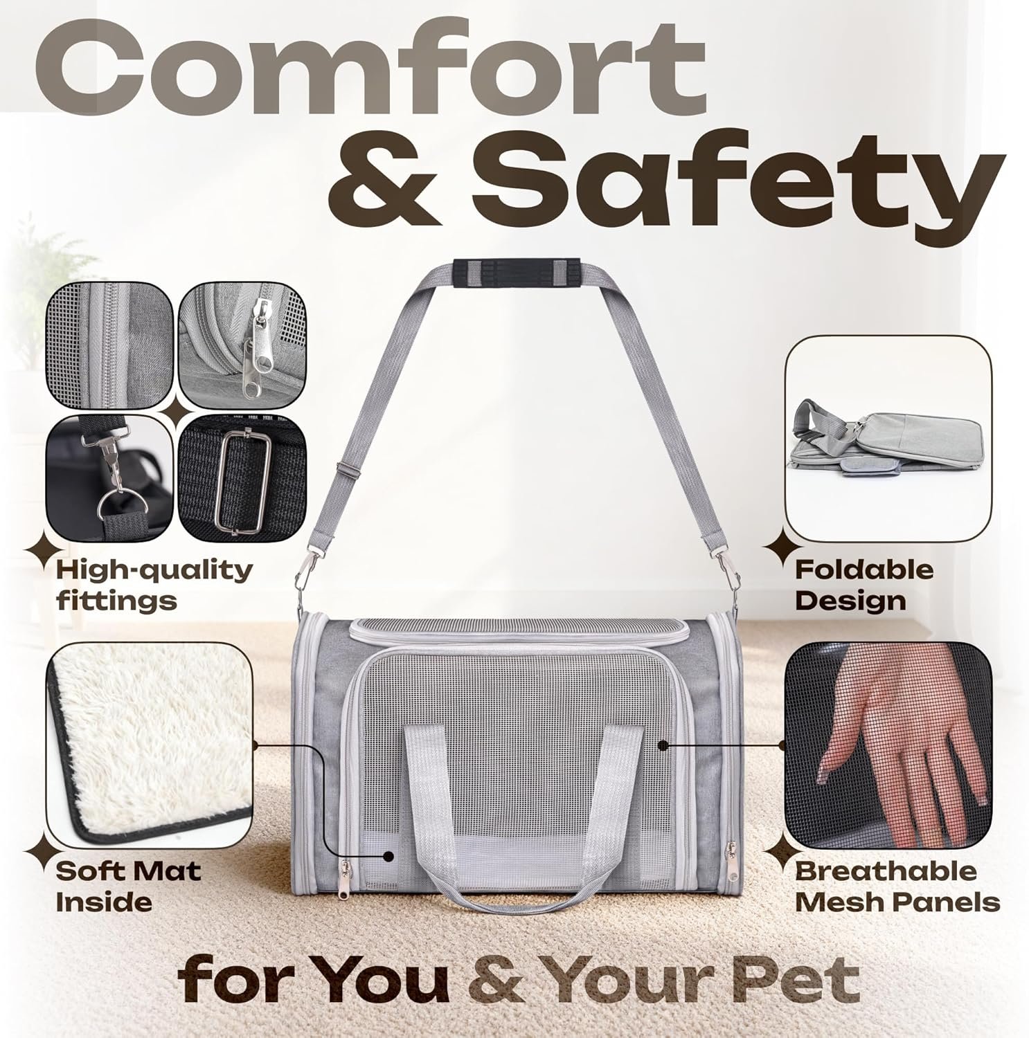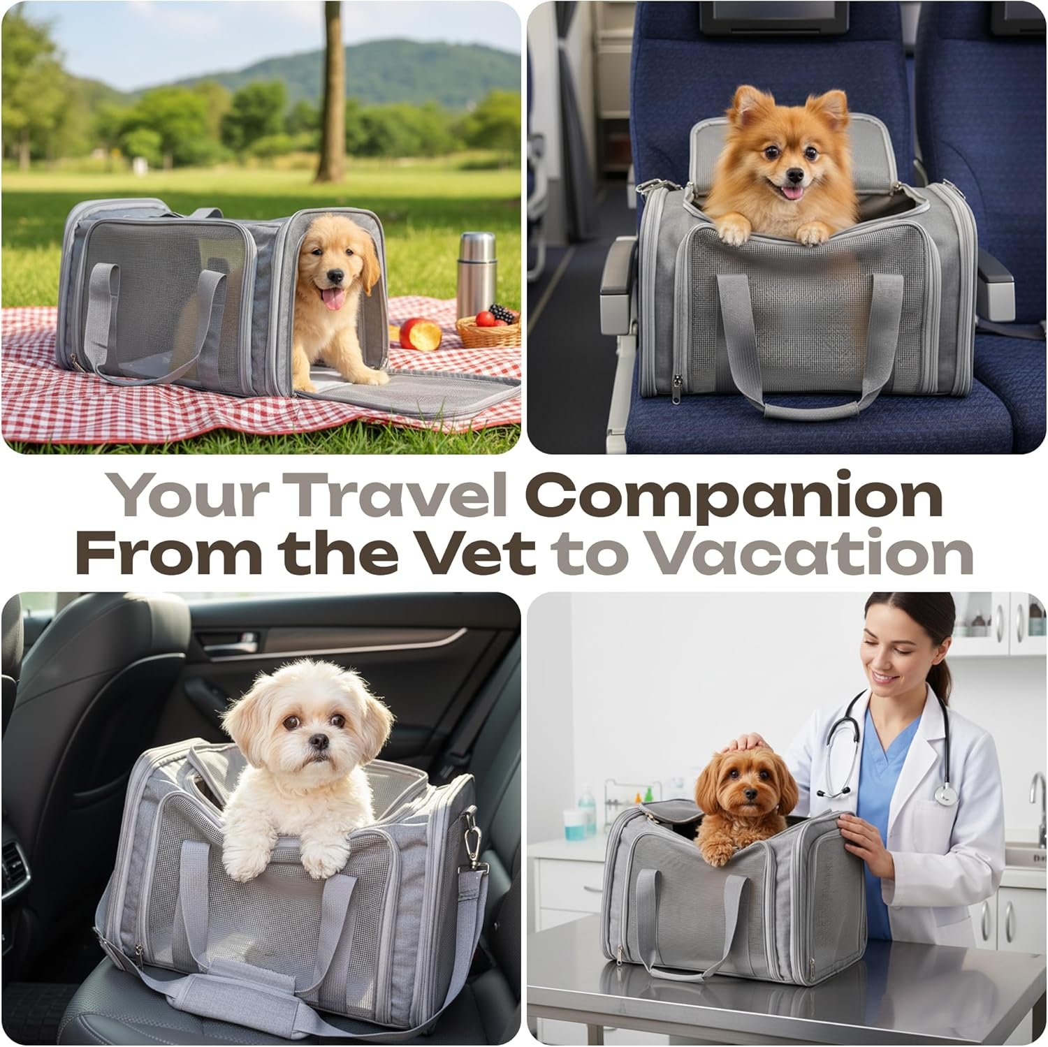 Airline Approved Medium Pet Carrier for Cats & Dogs – Foldable Dog Bag with Soft Mat, Breathable Mesh Windows, Travel-Ready Cat Carrier (Up to 15 lbs, Grey)