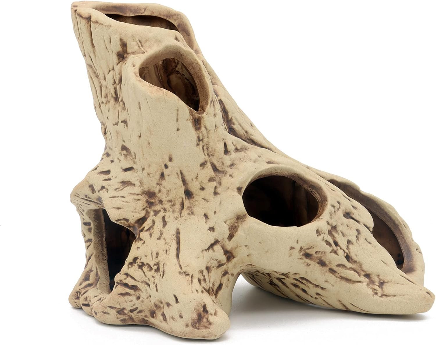 This ceramic decoration is designed to imitate the shape of a tree trunk, adding a natural atmosphere to your aquarium. It features multiple holes, making it easy to observe your pets and providing them with a place to hide, rest, and play. The decoration is also easy to clean, requiring only a rinse with water 2-3 times, and it does not fade.