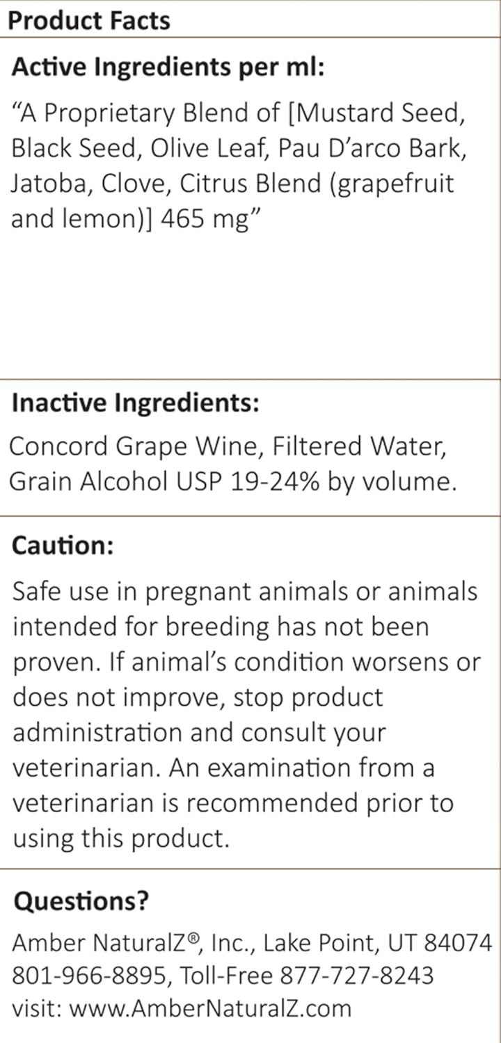 - A proprietary blend that includes organic and wildcrafted herbs such as Mustard Seed, Black Seed, Olive Leaf, Pau D’arco Bark, Jatoba, Clove, and Citrus Blend