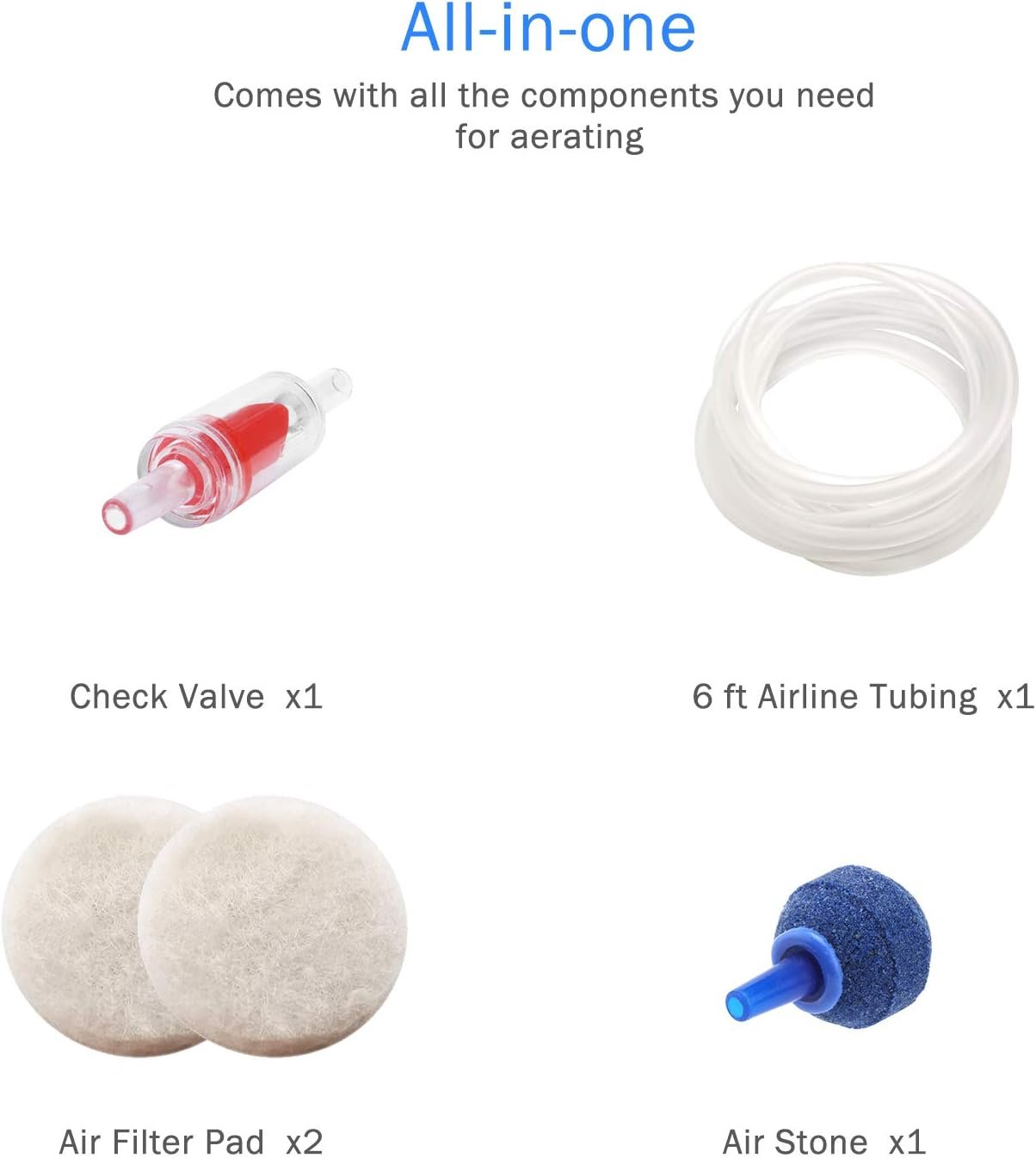 - Includes airline tubing, air stone, check valve, and air filter pad