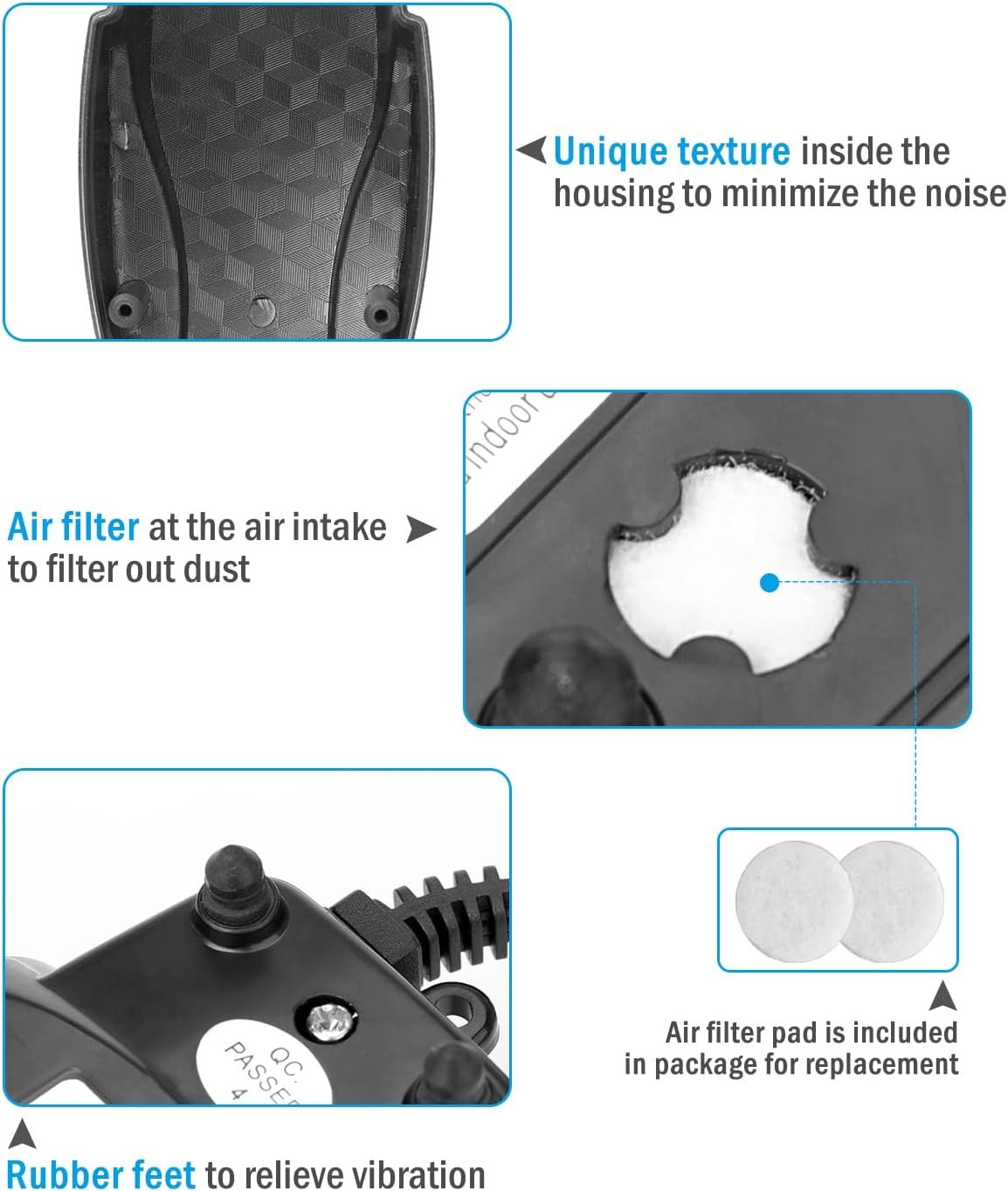 With its all-in-one design, this air pump comes with all the necessary accessories, making it a great value for aquarium owners. The included air filter pad works as a filter for the air coming into the air stone pump, and replacing it is easy and convenient.