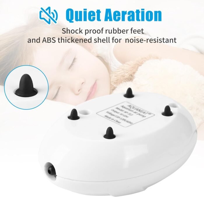The small air pump is designed for aquariums up to 20 Gallons, with a dimension of 4×2.75×1.5 inches. It is quiet and steady, with 4 rubber feet that keep it from sliding around to reduce noise further. This air pump is great for running a small air stone, sponge filter, air bubbler decoration, or other bubble ornaments for a small fish/shrimp tank or hydroponic system.