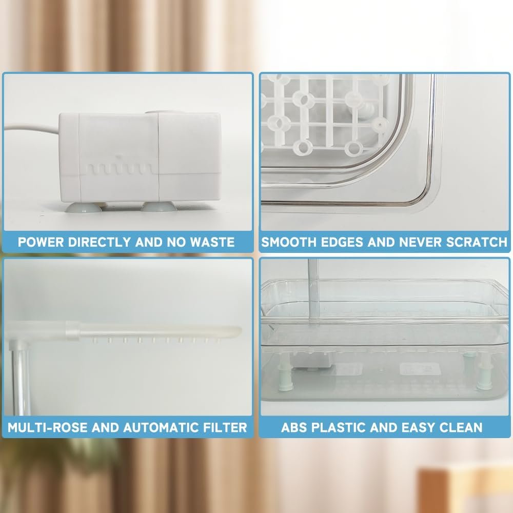 Simple but very functional bath tub for our parrot. Easy to assemble and use. Quiet and durable. Small enough to fit in any space. Water flow is just perfect and our parrot loves it.