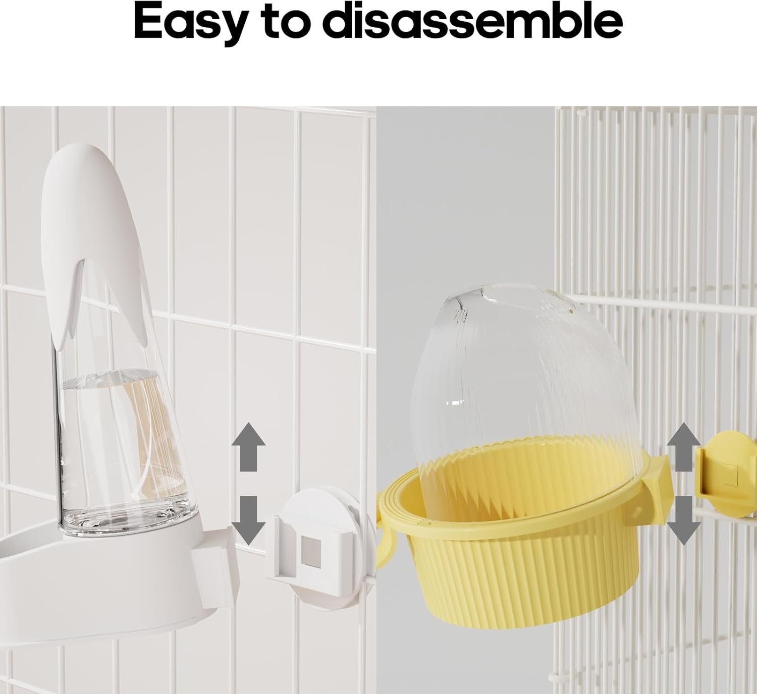 I really like this set of water dispensers and they are well made and easy to clean but the only problem that I ran into was that the bolts provided are too short to go through the cage bars when using the rest of the hardware needed to attach it. We may have a thicker gauge cage wire than most cages but the screws should come long enough to cover different cage bar thicknesses even if we had to cut the bolt to fit. It would be better too long than not long enough. It comes with a specific square head bolt that’s made to seat a certain way into the plastic hardware and is not easy to find in any hardware store so we had to figure out what to use to make it fit correctly. The only reason for 4 stars was because of too short of the bolt length. Otherwise very happy with them.