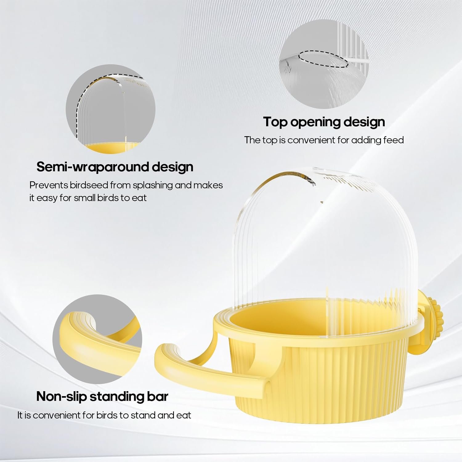 - Semi-wraparound design to prevent birdseed from splashing and make it easy for small birds to eat