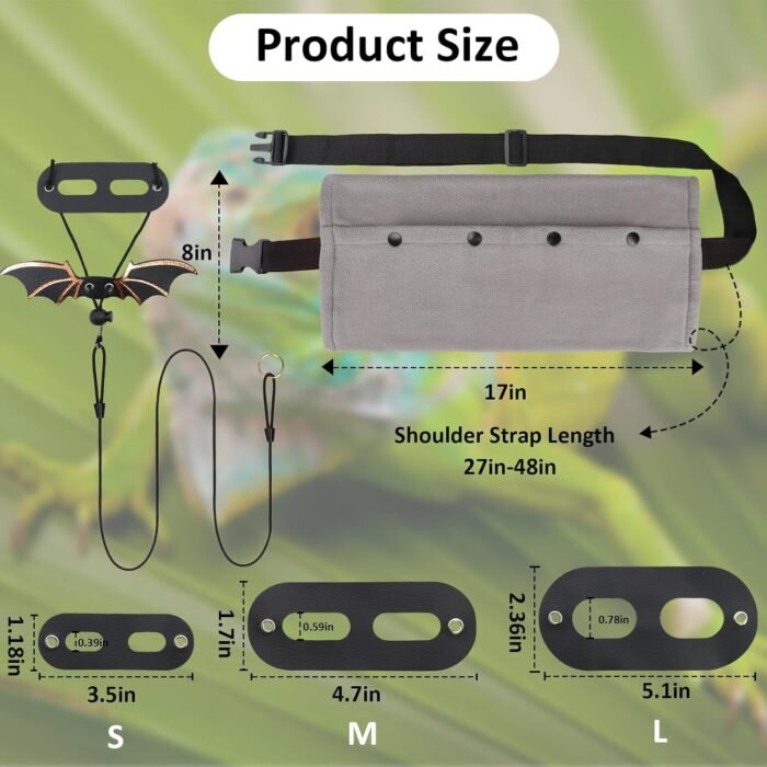 Our bearded dragon leash and carriers set is not just for bearded dragons; it’s also perfect for other small pets such as geckos, crested geckos, lizards, chameleons, and more. The bearded dragon leash is suitable for lizards of all sizes and dimensions, with three different sizes available: Small (length 9cm, width 3cm, leg holes 1.4×2.5cm), Medium (length 10.5cm, width 4.5cm, leg holes 1.7x3cm), and Large (length 13cm, width 6cm, leg holes 2.5x4cm). The leash is made from high-quality materials, including coral fleece, flannel, and resin, and has undergone quality inspection to ensure its safety and durability.