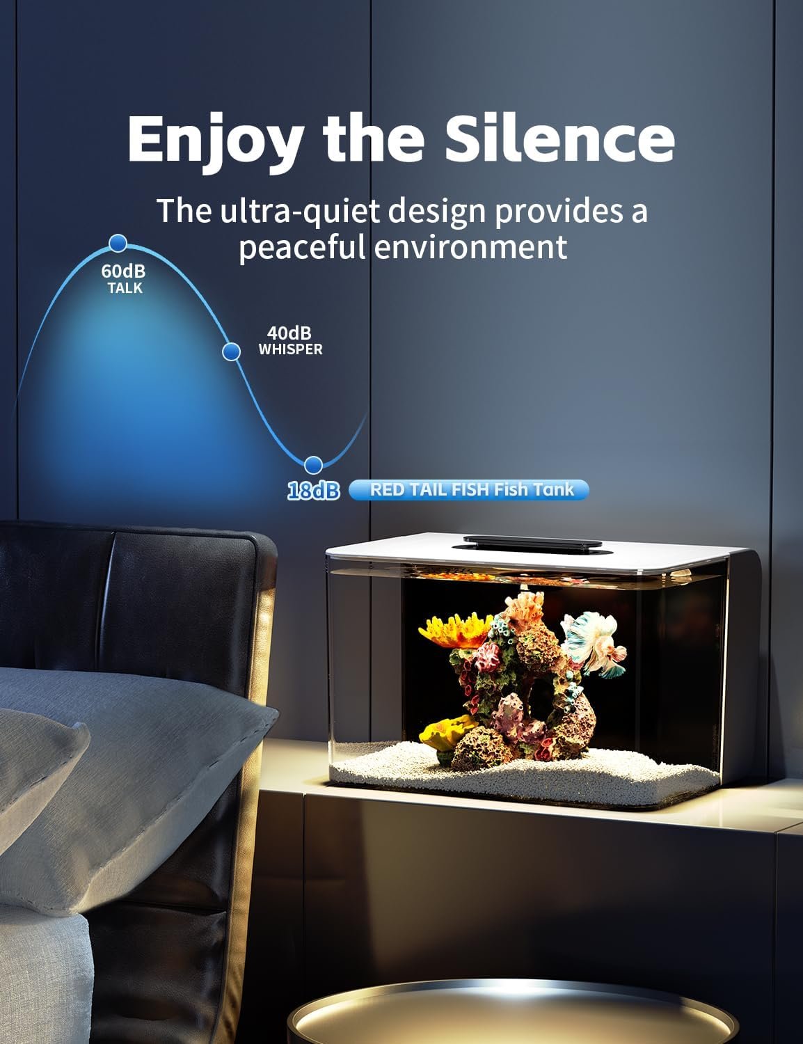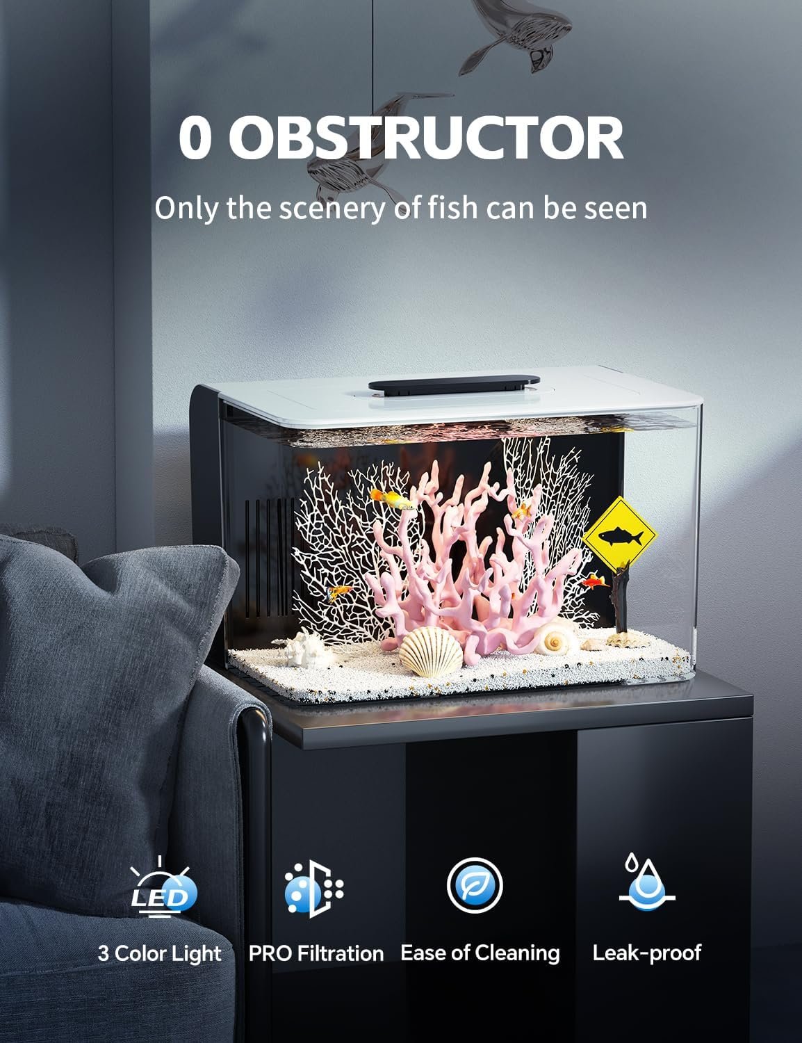This fish tank starter kit is designed to provide a comfortable and healthy environment for your fish. The power filtration system keeps the water clear for up to 1 month, and the hidden filtration design allows for a clutter-free aquarium. The adjustable water flow and ultra-quiet operation make it suitable for various small fish and reduce fish stress.