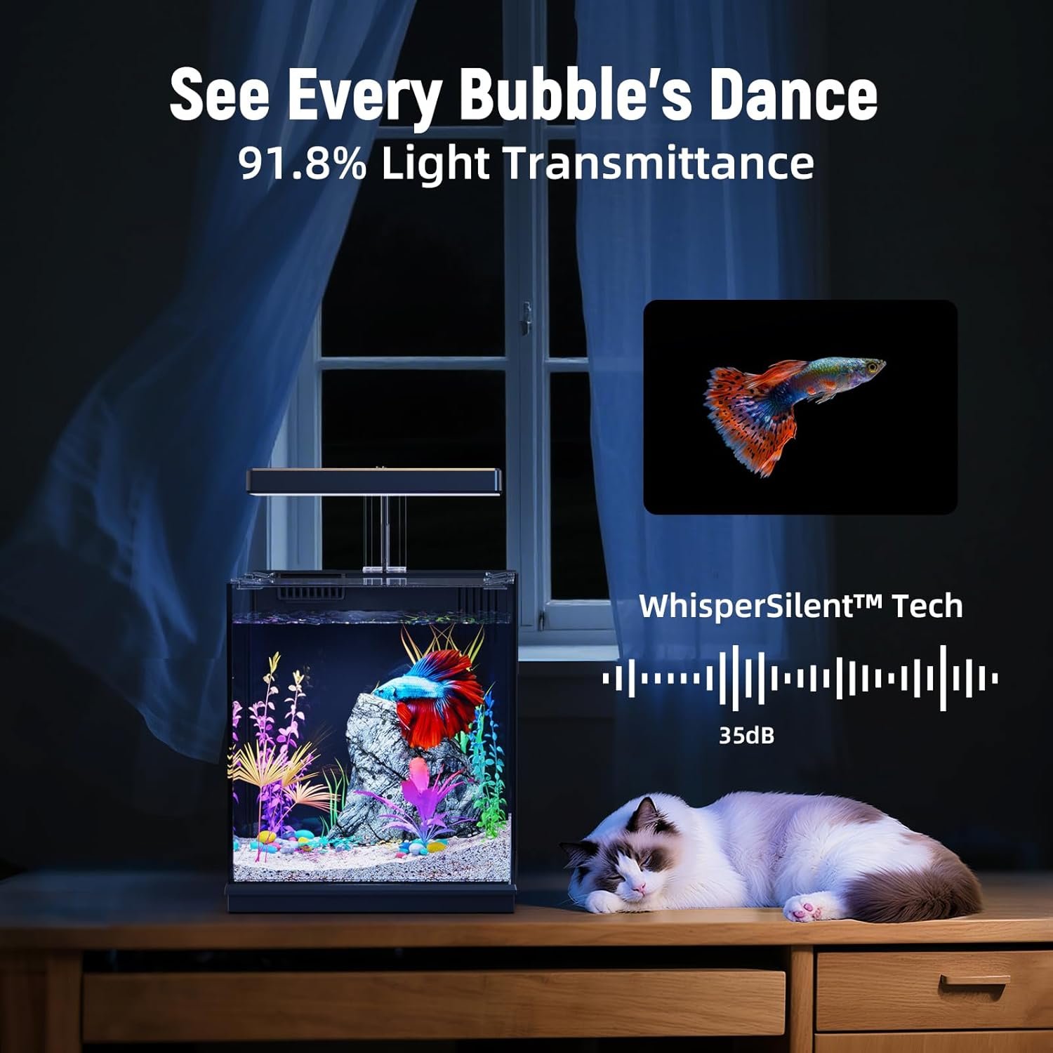 - An integrated LED lighting system that brilliantly illuminates and accentuates the natural vibrancy of the fish, operating at a whisper-quiet <35dB.