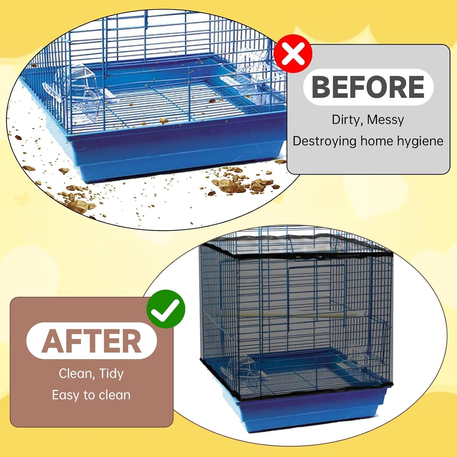 • Contains scattered seeds and feathers, keeping the floor clean