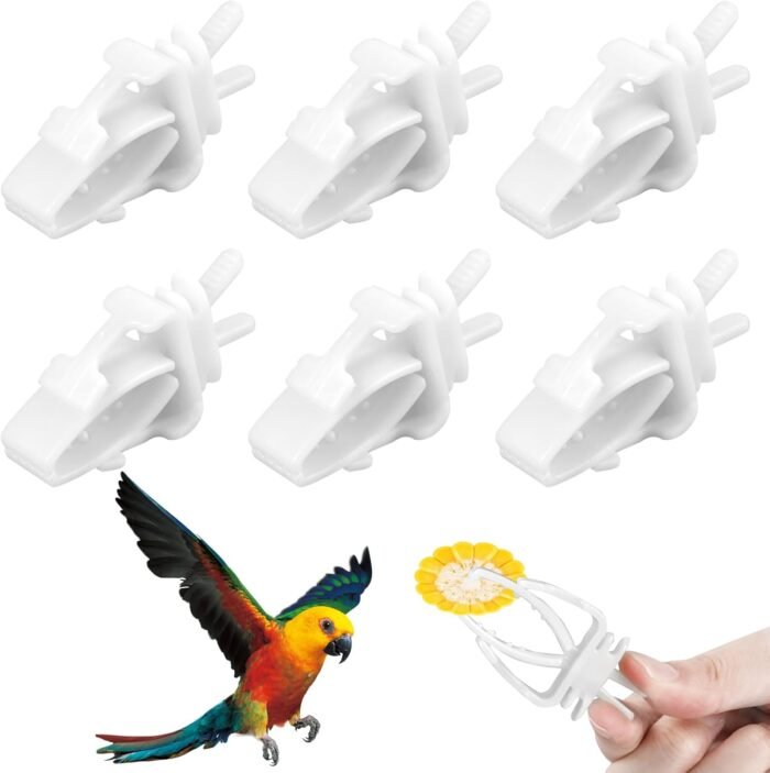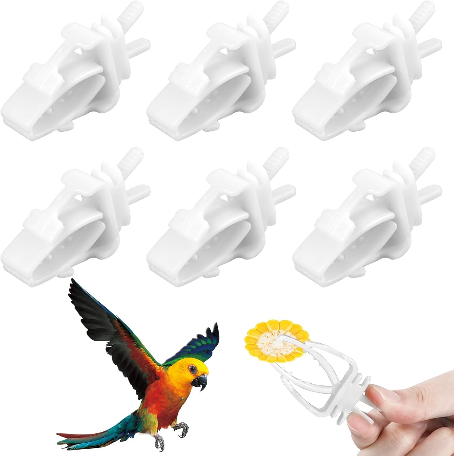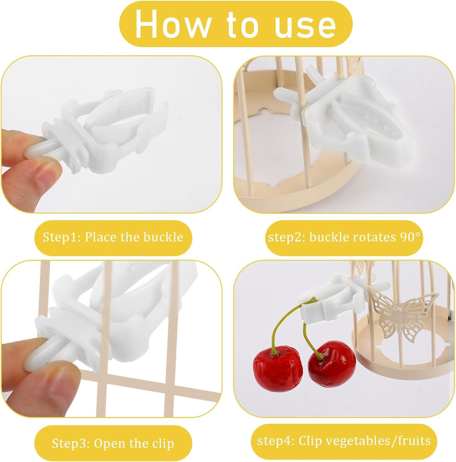 So I put one of these in each of my birds cages for veggies, fruit and millet to enrich their foraging activities. All 4 cages have different gauge bars. My thickest barred cage I thought it would not work it with some effort I carefully was able to slowly push it into place. The smaller flimsier cages fit a bit loose but it is doable. Remember if your bars are horizontal your clip will be side to side not up and down (vertical) as shown in my pics. The grip strength of the clip is good and holds a decent amount of veggies or whatever with only a bit of crushing occuring as the clip has to hold it in place.Birds can take up to a month to accept new things. My one American Turquoise Parrotlet hen went straight for it as she loves her veggies and was used to something similar with her previous owner. Previous owner was using those metal coffee bag clips but they had sharp edges and were rusting (toxic to birds) so I trashed them and was looking for a safer alternative. These are great so far. No metal so no chance of rusting and no sharpe edges. My Parrotlets and Parakeet likely will not destroy them, but I will of course be watching to see if they chew on them and will watch my GCC (Green Cheek Conure) a bit more as he has destroyed hard plastic rings before that are used to hang seagrass mats. These are a great little product for smaller bird species such as Parakeets, Parrotlets, Finch, lovebirds, bourkes, etc. I wouldn’t recommend for larger species such as African Grays, Amazons, Ringnecks, Macaws etc because they could quickly destroy it, unless yours don’t chew apart plastic. I think mid sized birds would be a hit or miss and the owner knowing their birds habits should purchase accordingly. For example Quakers and Conures may be ok with it or they may destroy it, so just know your bird. I’m glad to find a safer alternative to the rusted sharp metal clips. I will update in a month or so if they’re easily destroyed or if my Conure makes it into confetti lol.