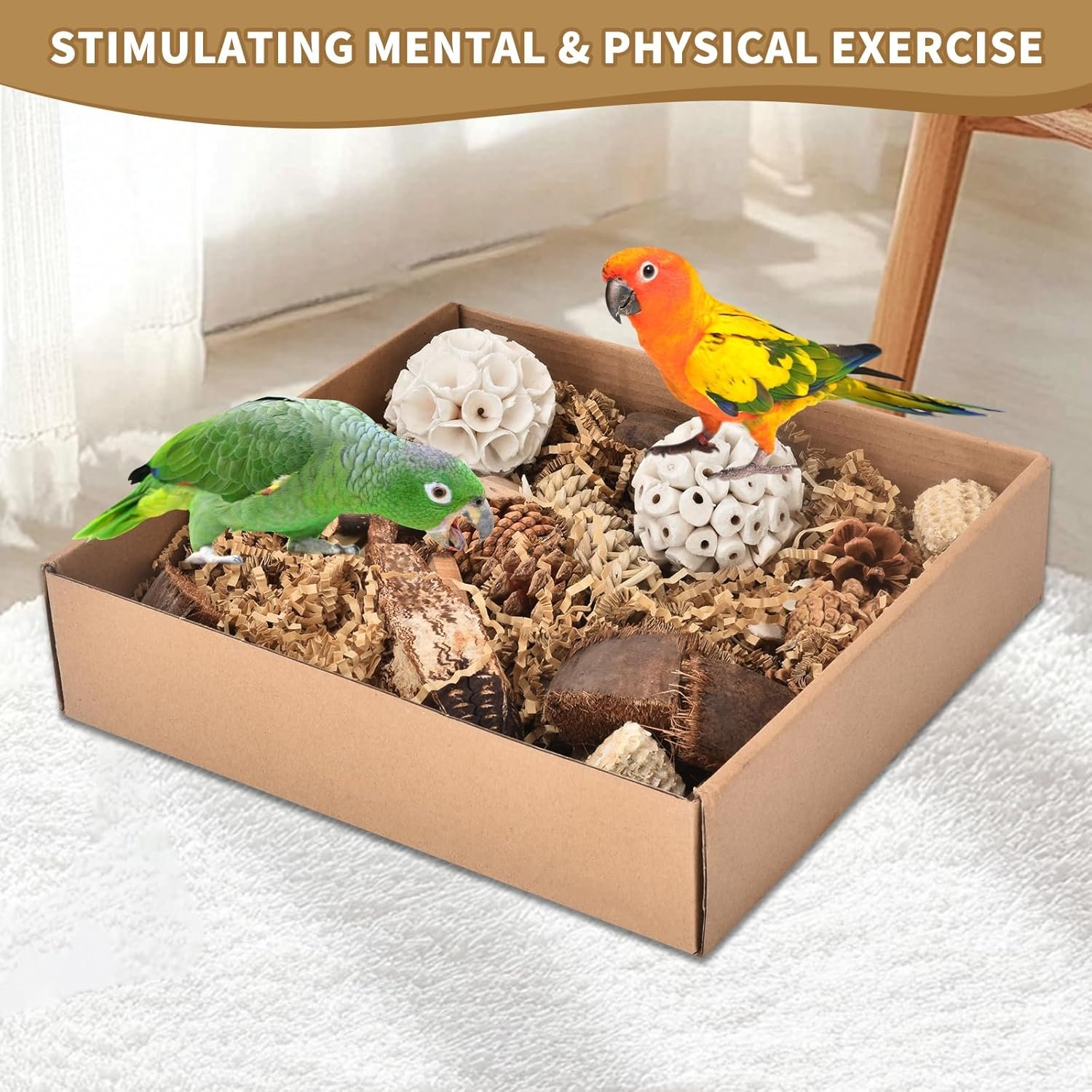 This is a great item. Useful for all different sizes of pet birds. Since foraging is a great way to occupy a bored bird and stimulate them to use their natural instincts, it is a great type of item to give your birds, even if it doesnât last long.They provide a good amount of very diverse items in this box. All of them are natural and chewable. They are all pretty good-sized chunks, yet all different sizes. A good number are handmade. What I like best is that the wooden pieces have holes drilled in them. Therefore, I will use those on homemade toys when I decide to be done with the box.The only issue I found was something that didnât concern me much, honestly. One of the brown, coconut-like shell pieces had something on the outside of it that looked like a dead moss or fungus that grew on the plant when it was alive (not after). I didnât know if that was something that was safe for pet birds or not, so I pulled that one little piece out. Better safe than sorry with pets. That is part of working with natural, outdoor items. Everything else in the box was clear of that sort of thing. Otherwise, all of it looks bird-safe from my experience with these types of items. It comes in perfectly dry and already mixed up in a little box. It is ready to open and immediately give to the bird. It is fine if they chew on the box too, since it didnât have any coloring or stickers.MY BIRDâS REACTION TO ITI had my conure explore it first and he was immediately interested and chewing away at things. He didnât dig things out. I donât think he thought about there being something under the stringy material. Later, I let one of my cockatielâs explore it, too. His name is Bell and he immediately jumped inside of the box and started running around in the material and chewing a little on things, including the box it comes in. Bell sees all boxes as potential nests, so he became a little possessive of the area. I did have the lid propped open, so if I removed the lid perhaps, he would quit that type of behavior. That little cockatiel is not very interested in toys usually, but since this involves foraging more, it is something that he should enjoy. My second cockatiel was too afraid of the box and especially the larger contents. She will enjoy it as soon as she warms up. It is nice to keep everything in the box, I plan to just pull it out for them occasionally, when I am sitting in the room. Some of the materials will be chewed up very quickly. That way it will last longer. The two large balls included where the most interesting thing to my birds. They had yet to explore the pinecones and whatever the shell is (looks similar to coconut). After warming up to the box a little, both of those birds were perfectly content walking around inside. My cockatiel has a habit of seeing boxes as his nests, so this was perfect for that in his mind. He started chewing on the sides of the box, too.I would 100% recommend this to bird owners. Birds need a lot of stimulation for their mental health and overall wellbeing, and foraging is fun and interesting to them. This is the ultimate foraging toy. I find it fun to give them new toys to play with as well. This being a large box of a variety of natural items, makes it even better than a toy. It is definitely a fun toy, it is fun to watch the birdâs experience it, and it provides a nice variety of natural items. Most importantly, it is Cockatiel and Conure approved!