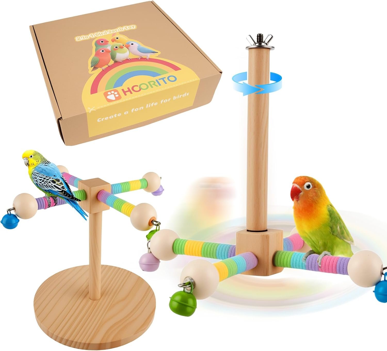 At first, my budgies were a bit shy, didn’t touch it for the first two days… but now they absolutely LOVE it! 🐦💛 The 360° rotating perch keeps them entertained for hours, and the bells make it extra fun.My budgies always love cotton rope and bells .I love the 2-in-1 design, can use it in the cage or on the tabletop. Setup was super easy thanks to the one-piece bearing; no complicated installation like other stands. The pine wood feels sturdy, and the soft cotton rope is perfect for chewing and gripping safely.Perfect size for my budgies, and I’m sure it works for parakeets, cockatiels, lovebirds, and other small to medium-sized birds.It’s not just a toy, it’s a play + rest + interaction spot! Highly recommend as a gift for your feathered friends 🐥🎁.