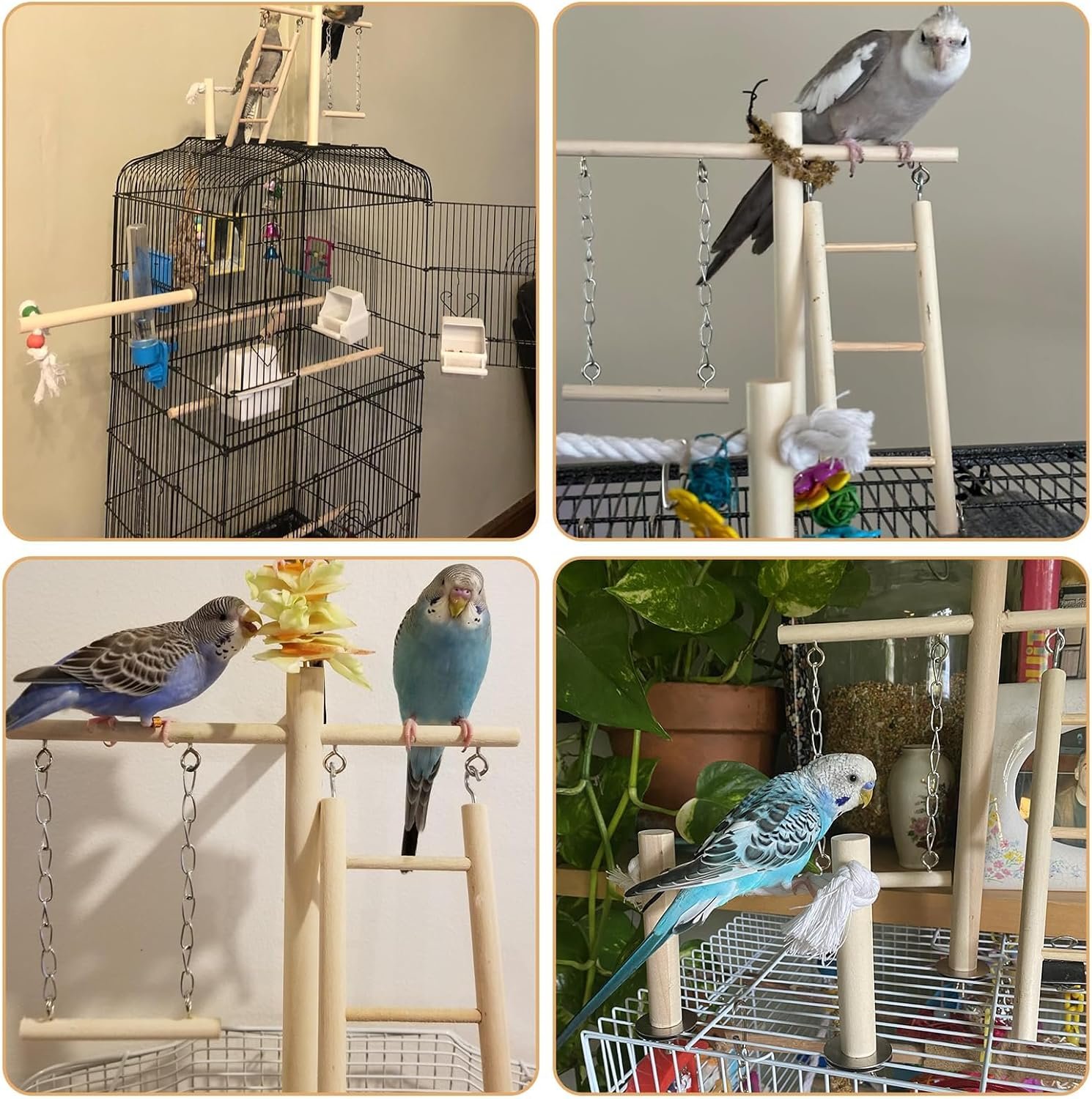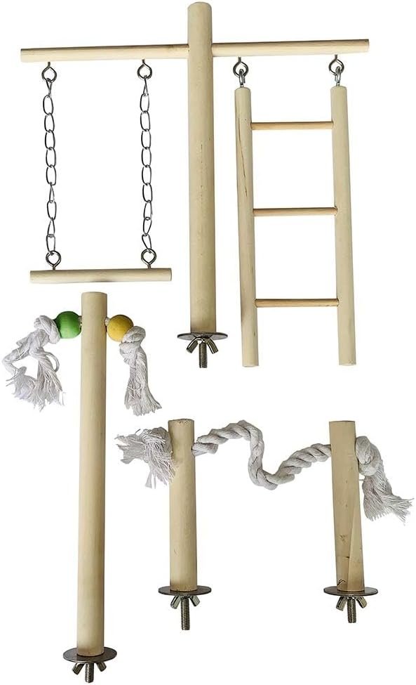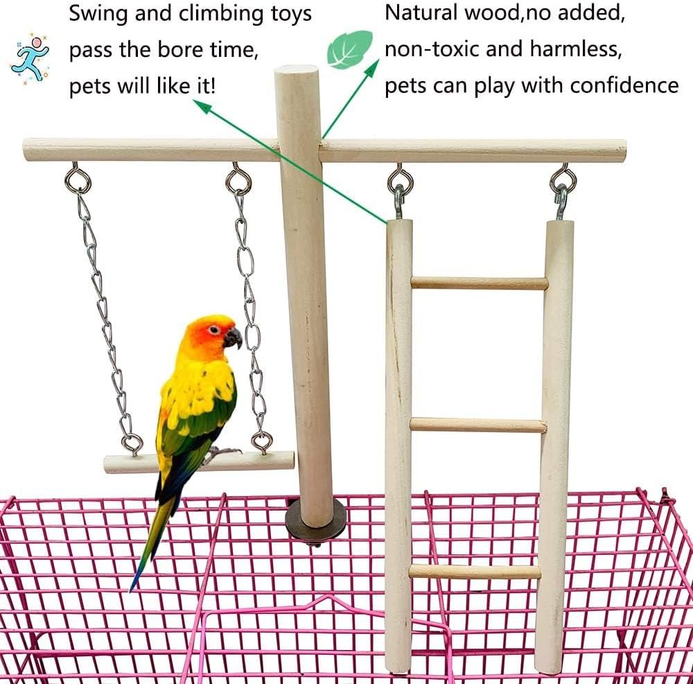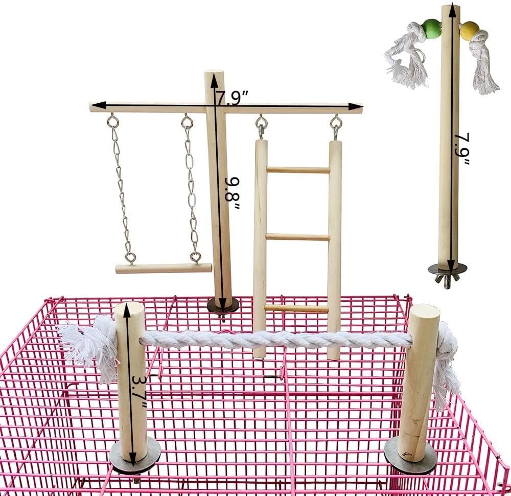 - Includes a rope bridge, ladder, swing toy, and long bird perch toy