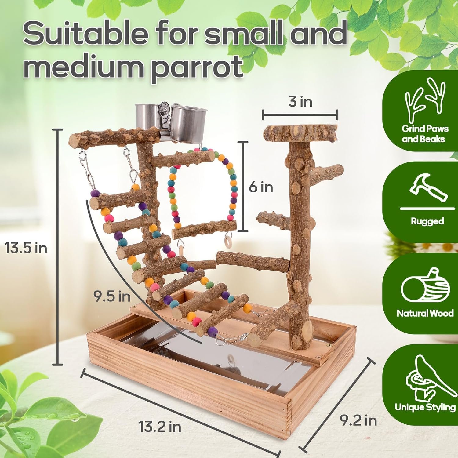 This bird playground includes several features that make it an ideal choice for small to medium-sized parrots. The product specifications are as follows: 13.2” x 9.2” x 13.5” (product size), 2.65 lbs (product weight), 1” (main stem diameter), 0.6” (perches diameter). It is suitable for cockatiels, parakeets, budgies, lovebirds, and other small to medium-sized parrots.