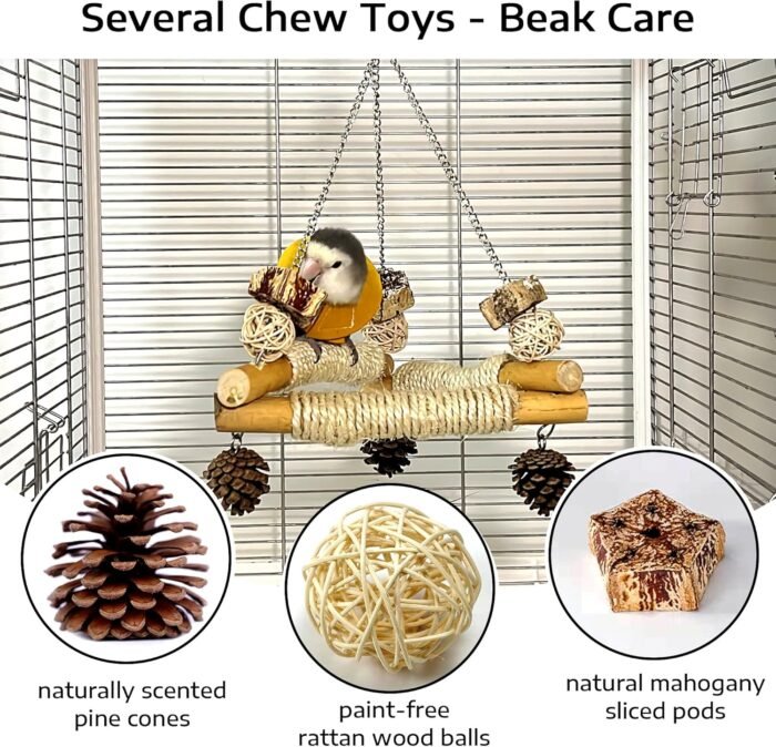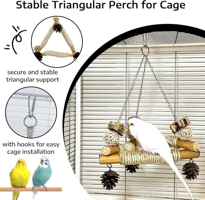 • Stable Triangle Perches: The swing features 3 sturdy wooden perches arranged in a triangle shape, ensuring stability even during active play. Its balanced design provides a secure space for parrots to perch or swing safely without tilting.