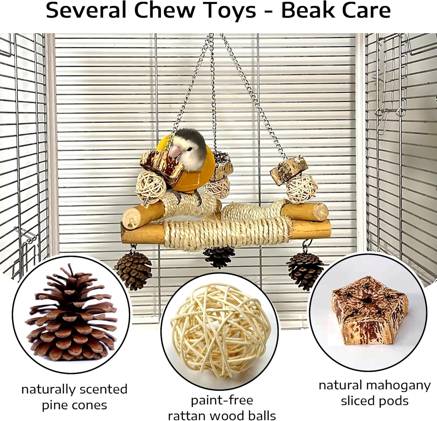 • Natural Beak Care: The hanging bird swing perch includes dye-free, fiber-rich bird chew toys (rattan balls, pine cones, padauk pods) to satisfy birds’ gnawing instinct. Parrots can safely grind beaks while swinging to prevent overgrowth.