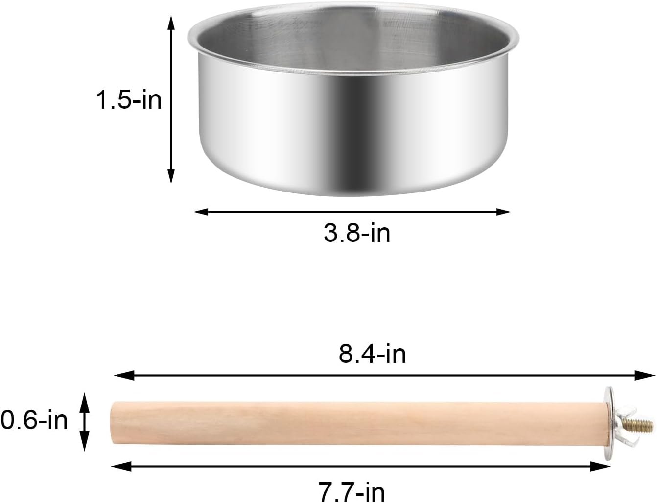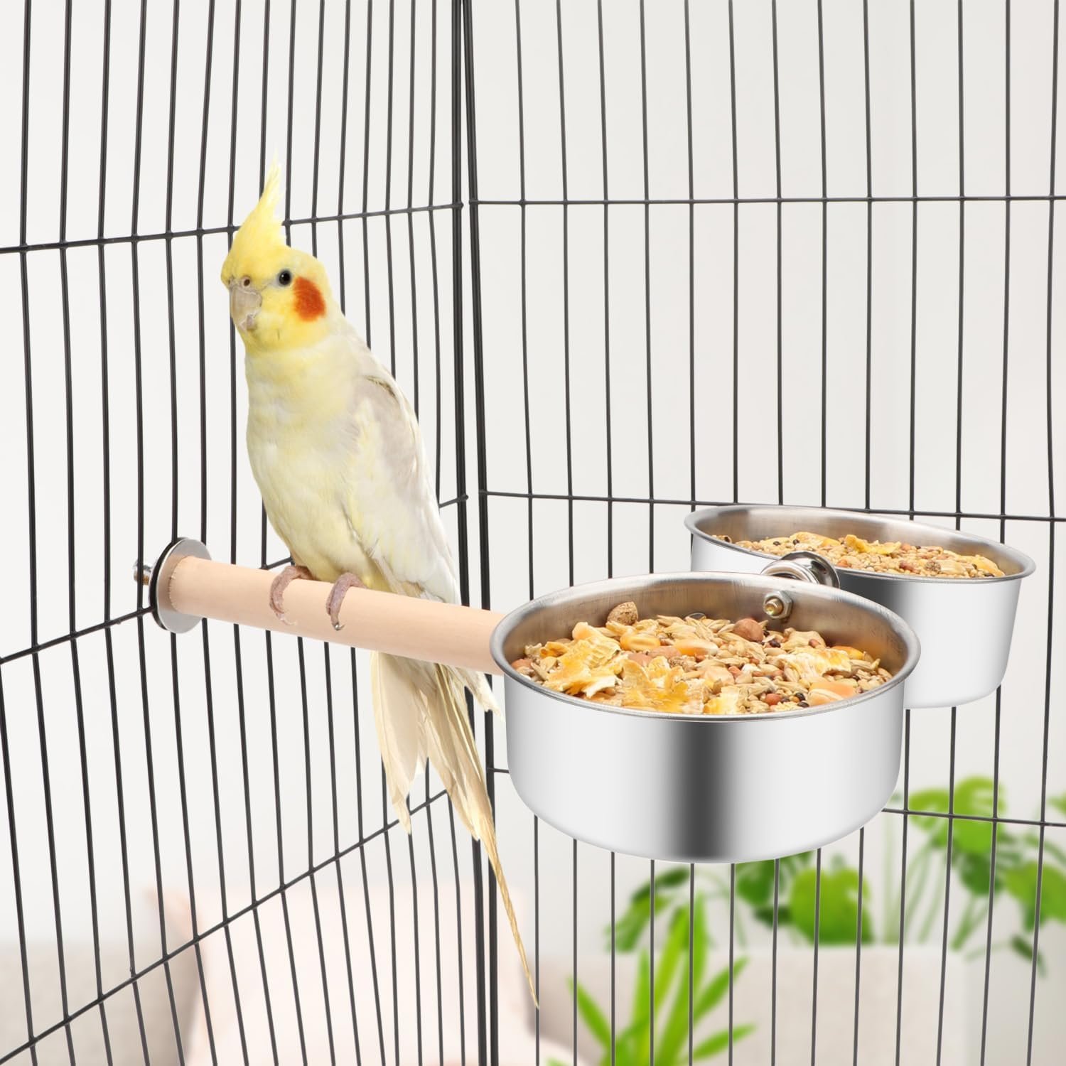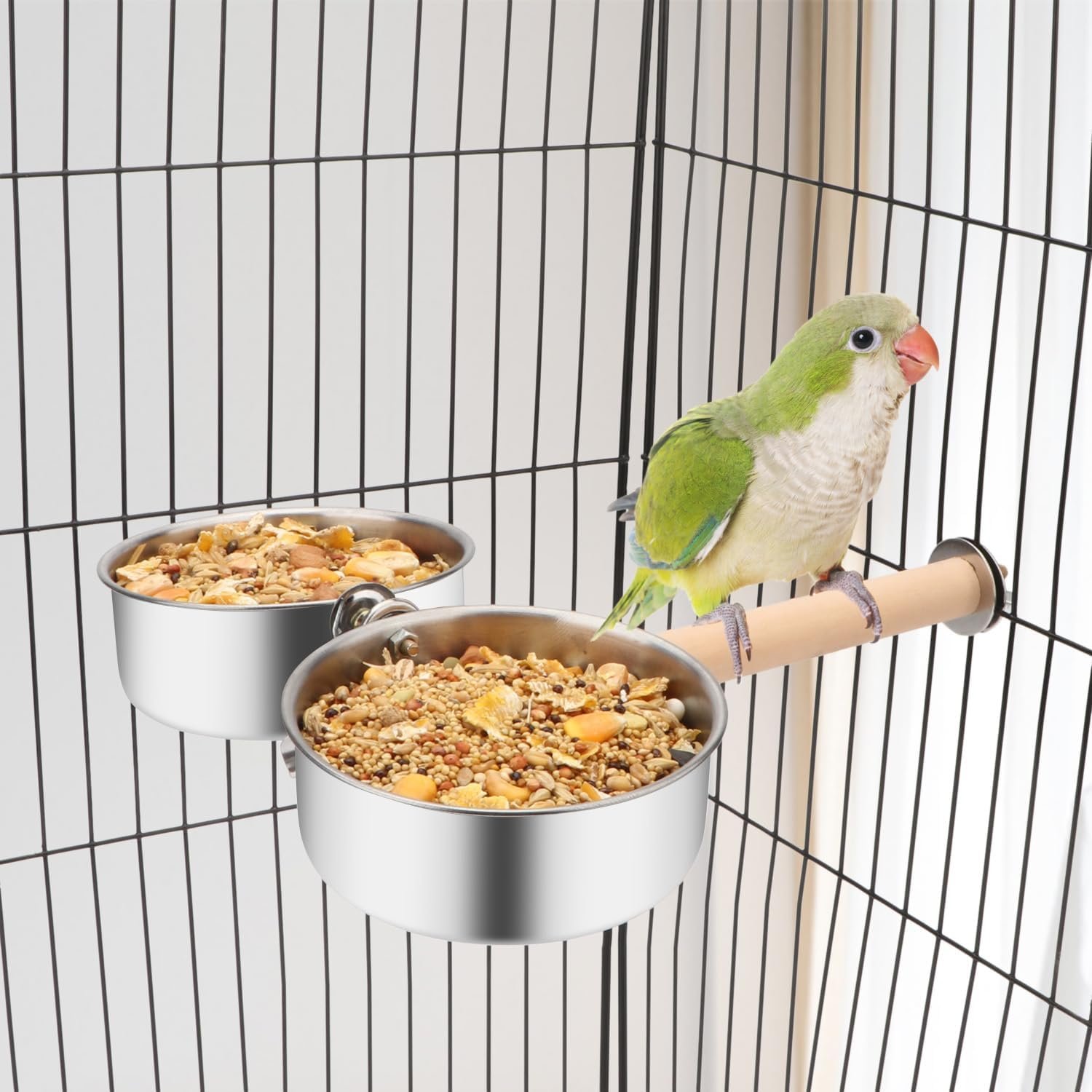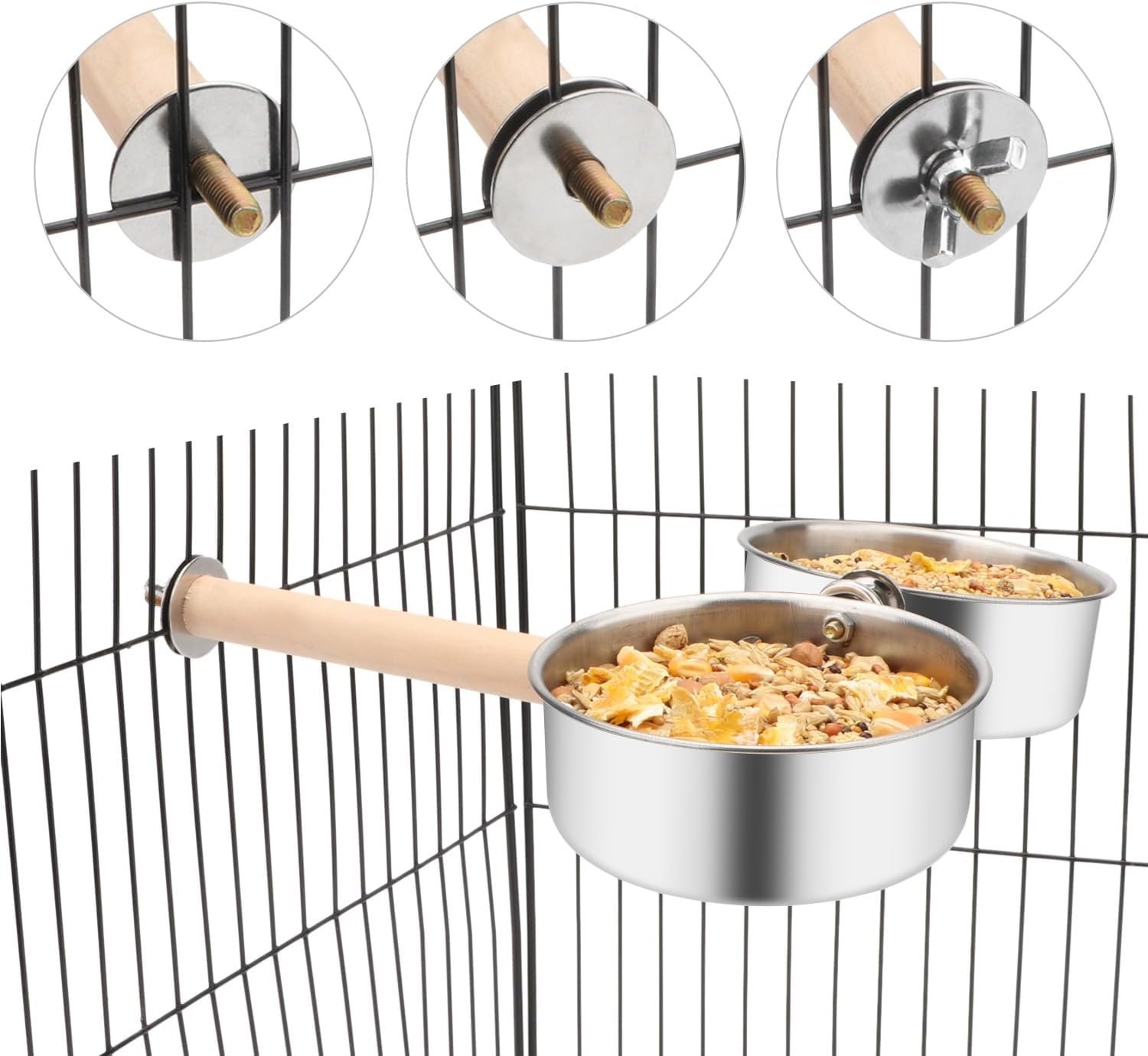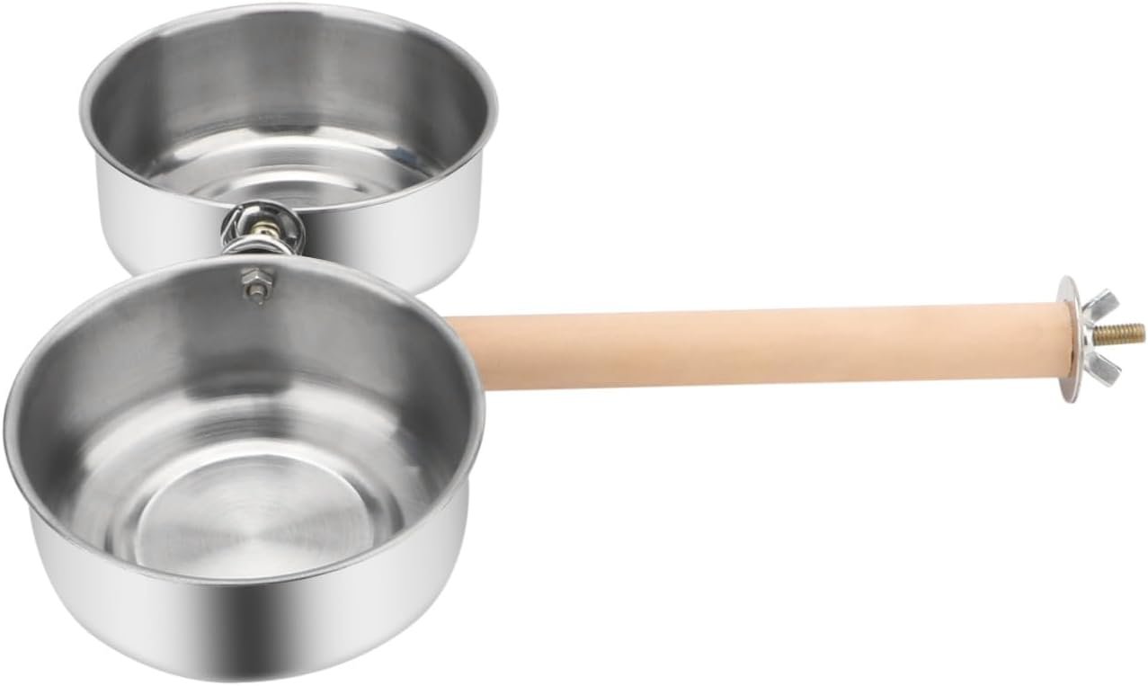 Our product is made of wood and metal material, making it a multipurpose tool that serves as a food and water feeder bowl as well as a stand perch platform. It is bite-proof, with clips, smooth and suitable for long time use. The wooden stand holder allows for easy installation to any place of a bird cage for easy standing. It is also easy to use, as the bowl is easily removed, convenient to clean. Used for holding food or water, it prevents your bird from accidentally tipping the bowl, making it well-organized.