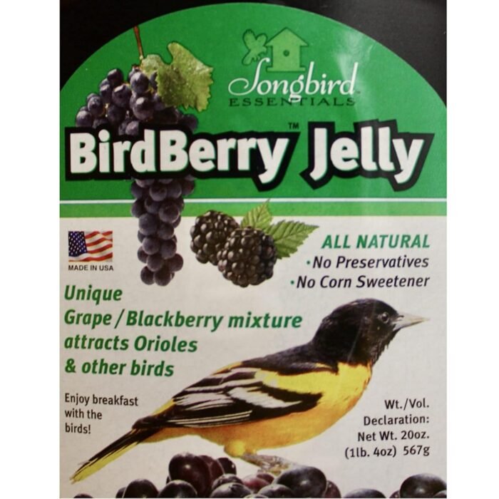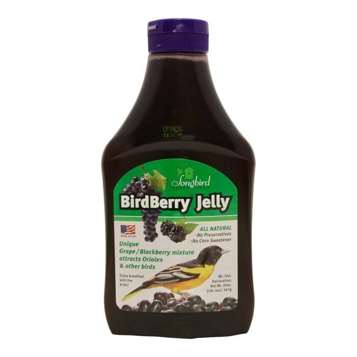 BirdBerry Jelly is an all-natural, food-grade mixture that will become a favorite of your feathered friends and keep them coming back to your feeders. The jelly is a unique combination of pure Concord grapes and blackberries, containing no artificial sweeteners.