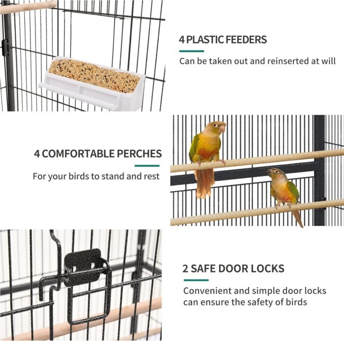 - Multi-door Design: This parakeets cage features 0.7 inches bar spacing to keep birds safe in the cage; 2 large doors are designed on the front for easy open & close, and 4 assembling feeders; 4 small side doors facilitate close interactions and easy cleaning.