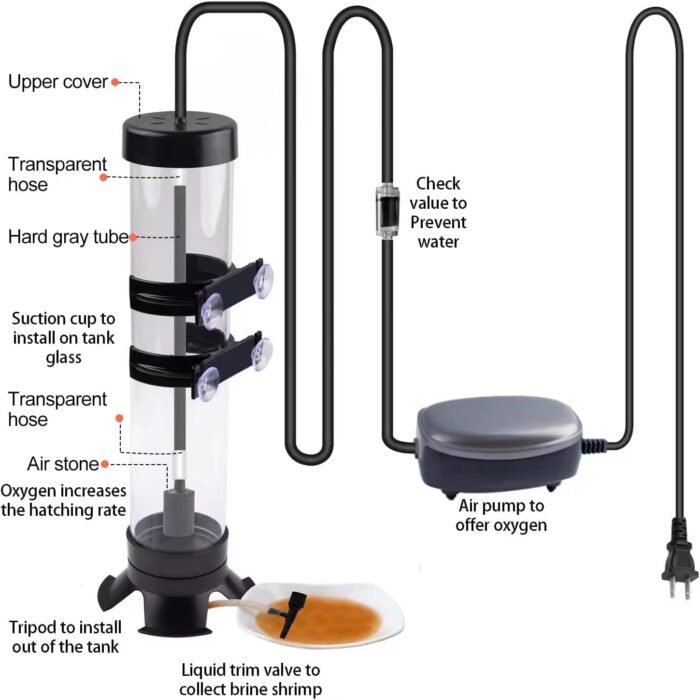 - Easy Collection: Allows for easy collection of hatched brine shrimp by opening the trim valve at the bottom of the incubator.