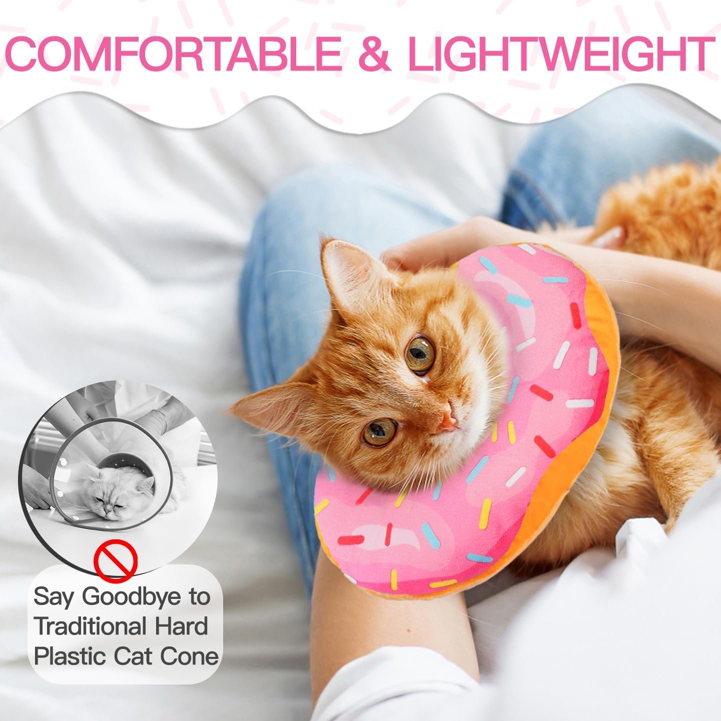 The WONONE Cat Cone Collar Soft is a perfect alternative to traditional Elizabethan collars. It works like a plump barrier around your cat’s neck, preventing them from biting and licking injured areas or surgical sites. Not just for recovery after surgery, it is also suitable for in vitro deworming, nail trimming, and grooming. The playful and adorable donut shape makes it like a pet ornament instead of a cat surgery collar, making your pet happier.