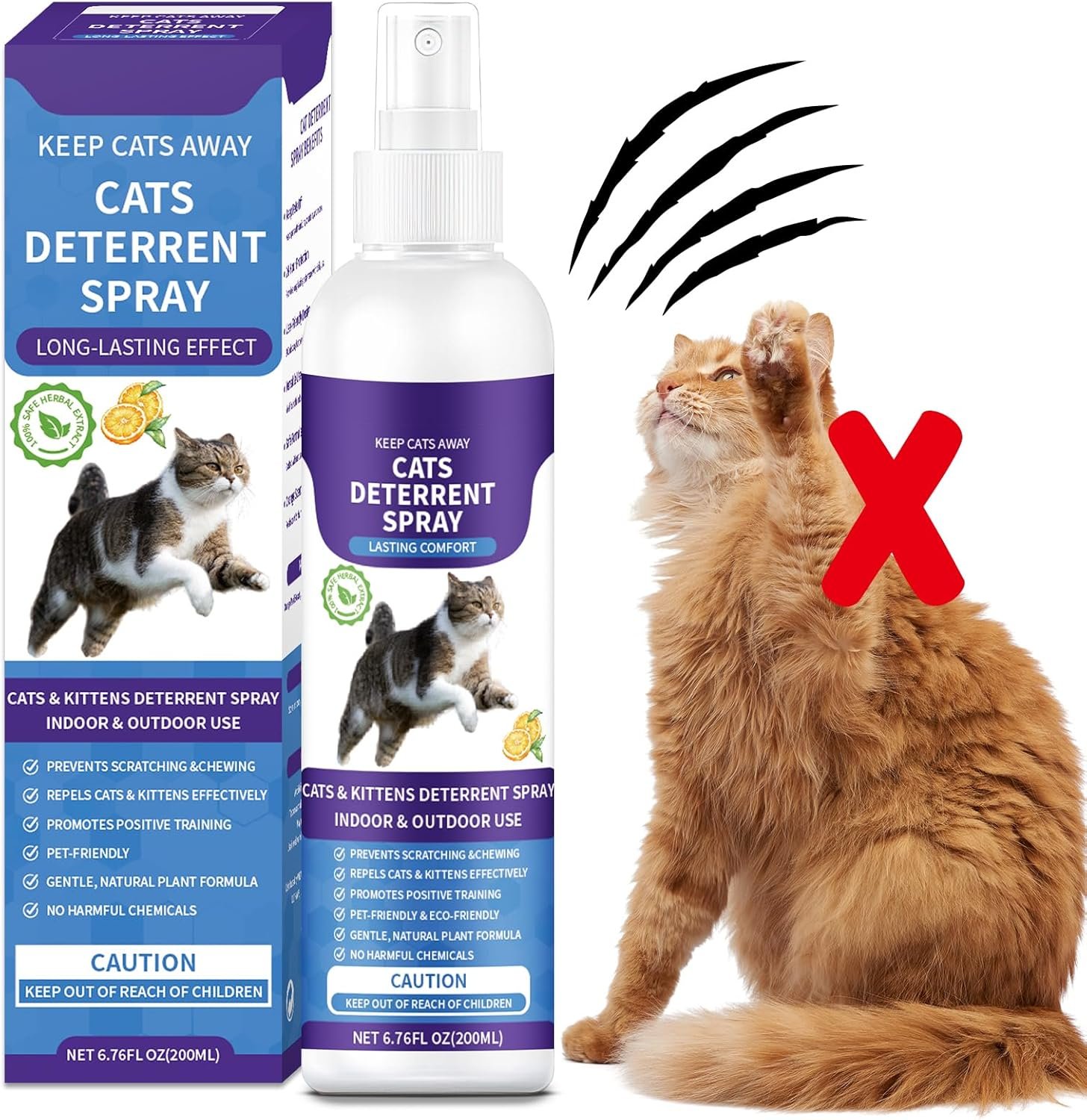The TELUNSU Cat Deterrent Spray offers powerful protection for your furniture, curtains, carpets, and plants. Designed to prevent scratching and chewing, it helps safeguard your belongings while creating boundaries for your cats. With consistent use, you can stop your cat from causing damage to your home. The spray is formulated with natural ingredients like citrus and rosemary, making it non-toxic, alcohol-free, and safe for both cats and kittens.