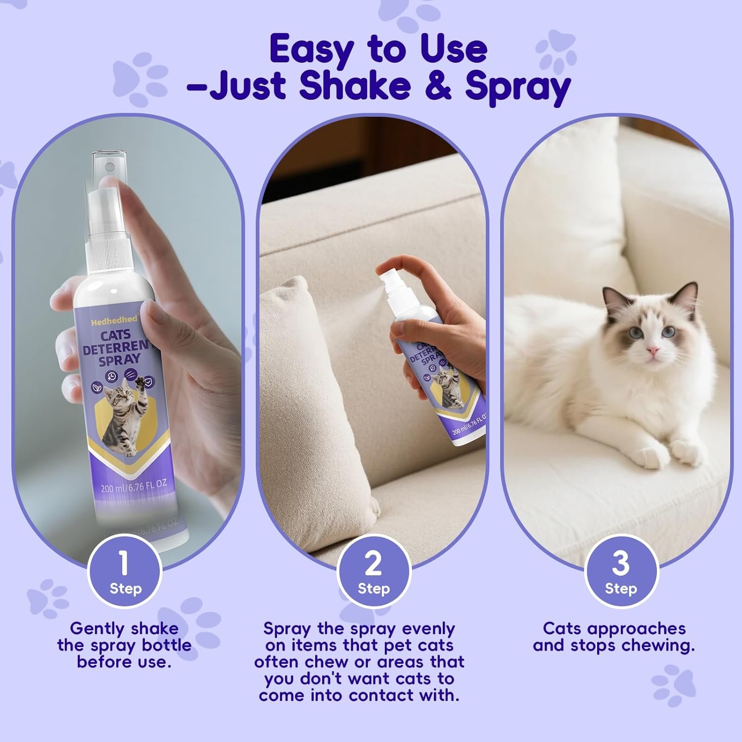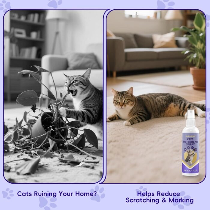 Our cat deterrent spray is a safe and natural solution to protect your home from unwanted cat behaviors. Formulated with powerful, natural extracts like Peppermint, Witch Hazel, and Lemon, our spray emits a fresh scent that cats naturally dislike. It’s completely free from harsh chemicals, safe for your pets, children, and the environment, providing you with a peace-of-mind solution to protect your home.