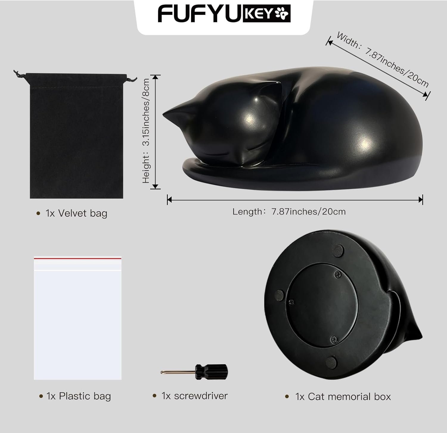 • Dimensions and Capacity: The cat urns measure 7.87 x 7.87 x 3.15 inches (20 x 20 x 8cm) with a capacity of about 0.8L, suitable for cats weighing up to 24.25 lbs (11 kg).