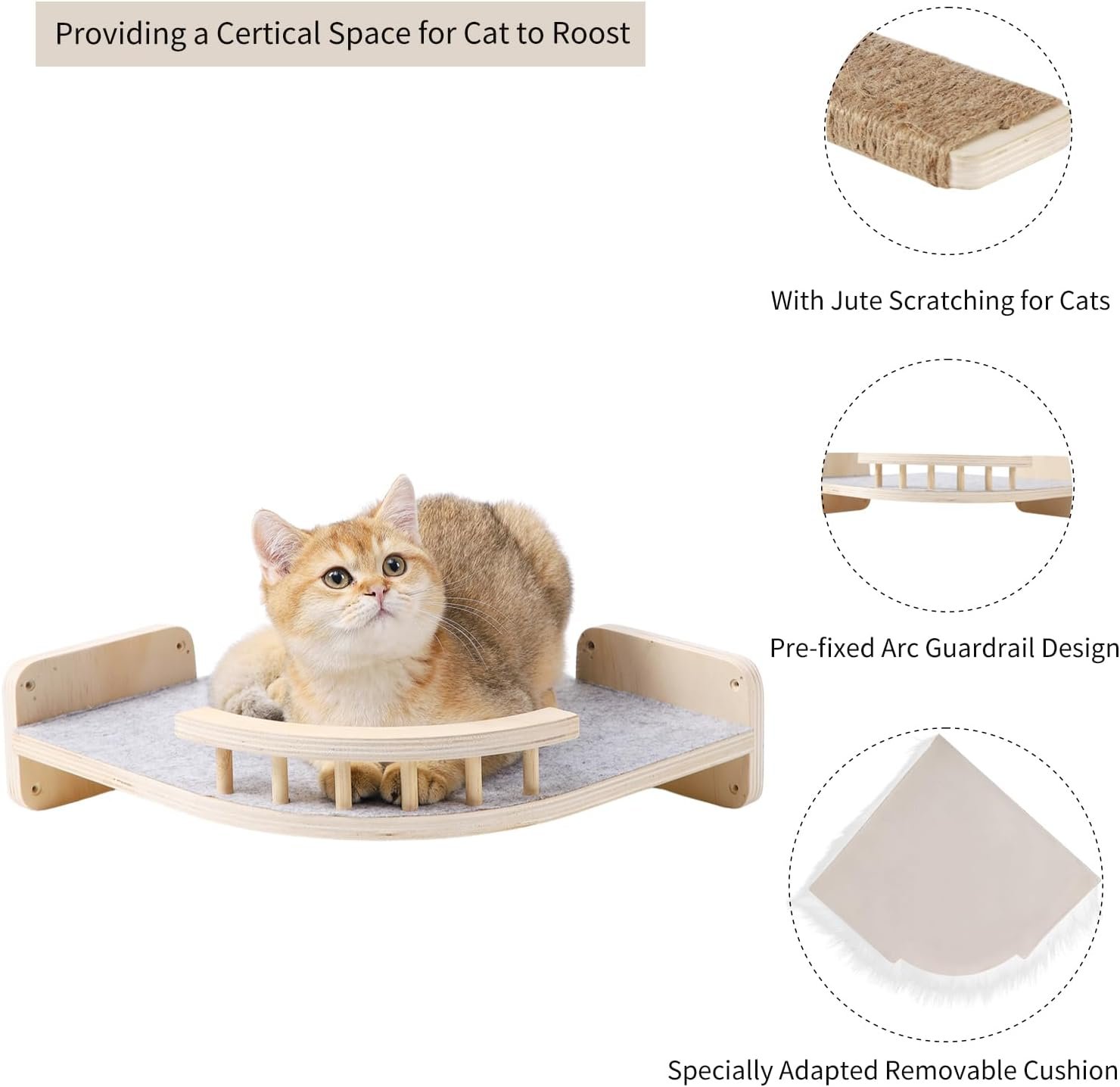Cat Wall Shelves – 3 Steps Scratch Post & Hammock Bed with Plush Cover, Climbing Shelf for Indoor Cats (Wood)