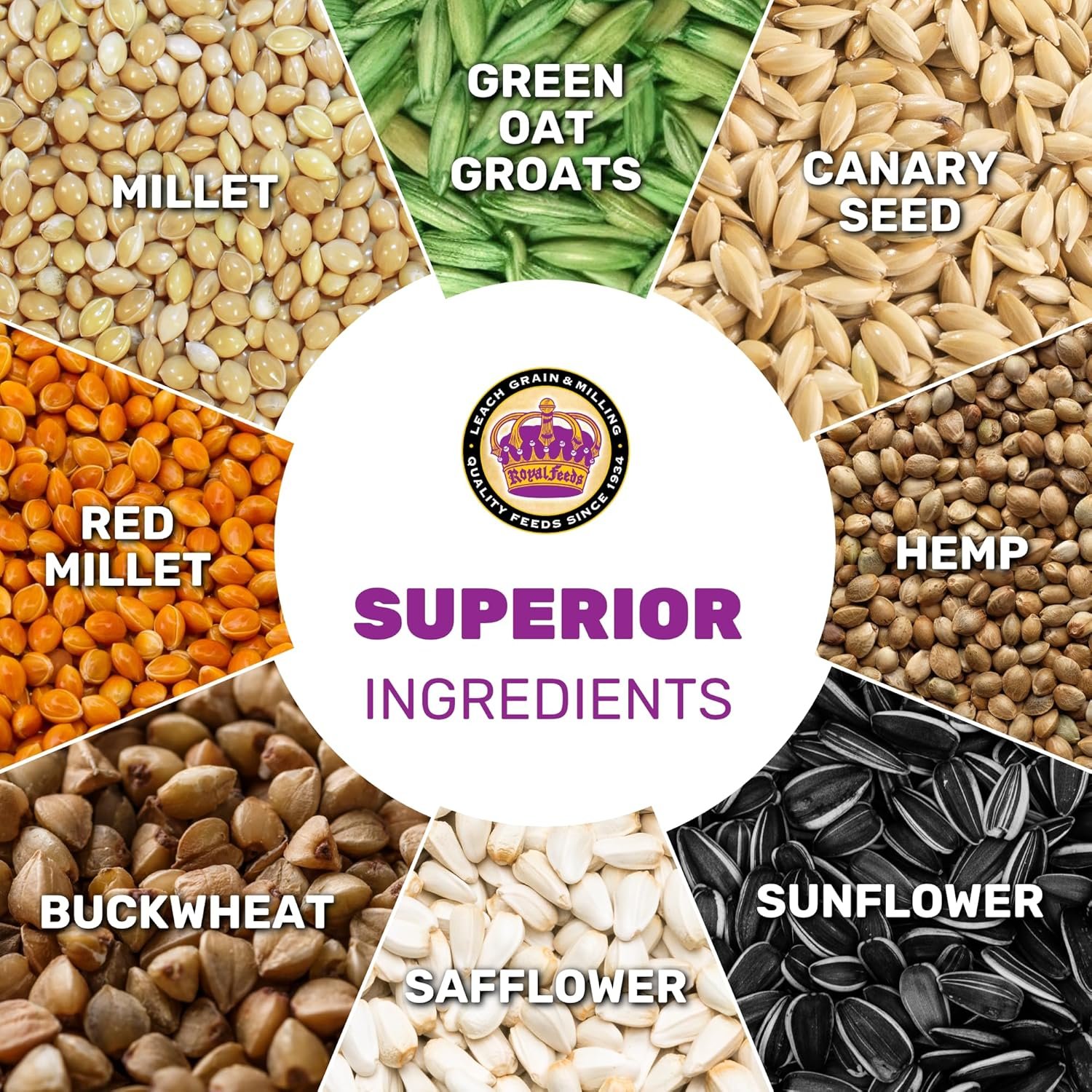 - Offers a balanced diet with a mix of seeds, including millet, safflower, and buckwheat