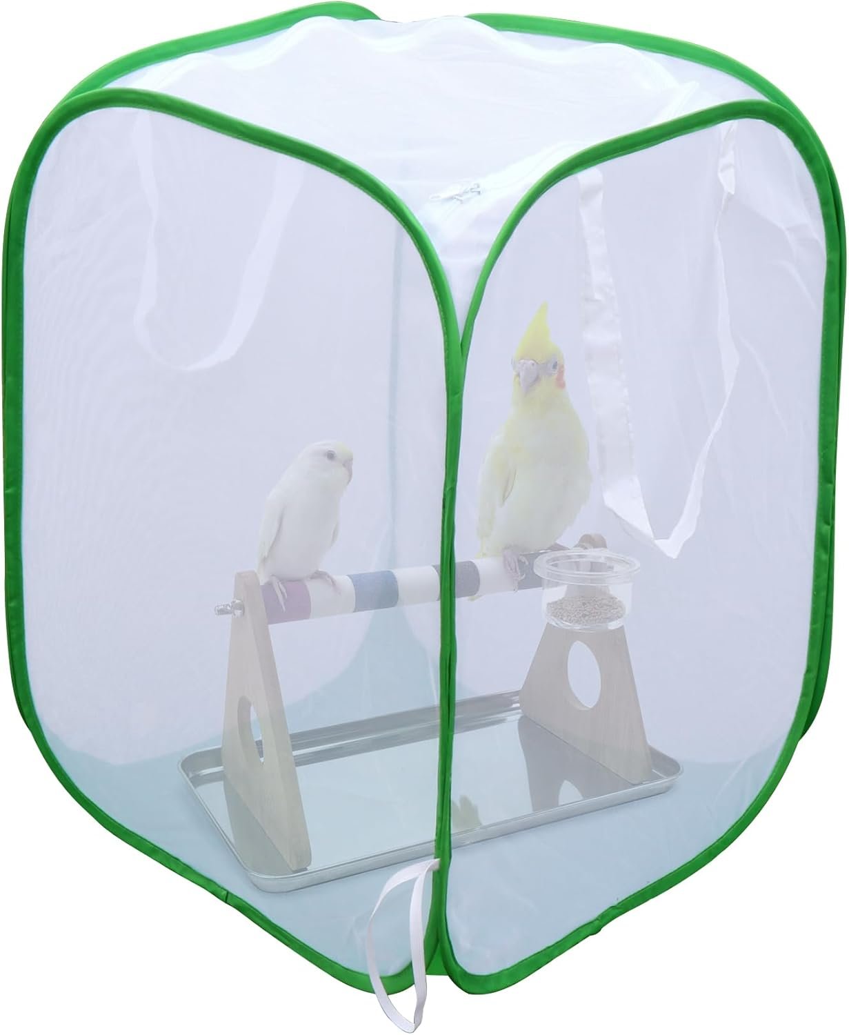I really like this mesh cage. It allows me to safely take my bird outside to enjoy the world without fear that he flies away and doesn’t come back. It’s very lightweight. The handles make it easy to carry, while the size provides ample room for him to fly around. It also is a nice secondary cage to put a bird in while cleaning their cage, but since it’s mesh and collapsable, you don’t have to worry about it always taking up too much space when not in use. Quality is great. Zippers seem very good quality.