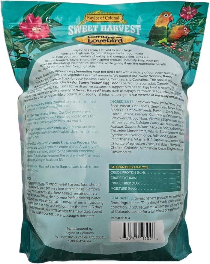 KAYLOR Sweet Harvest Enriched Conjure Lovebird is a premium seed mix specifically designed for Conures and Lovebirds. The mix contains a blend of natural ingredients, including Safflower Seed, White Prose, Canary Seed, Wheat, Oat Grouts, Green Peas, Barley, Buckwheat, Black Oil Sunflower Seeds, Pumpkin Seeds, Papaya, Carrot, Raisins, Peanuts, Cuttlebone, Cinnamon Sticks, Safflower Oil, Soy Flour, and various vitamins and minerals.