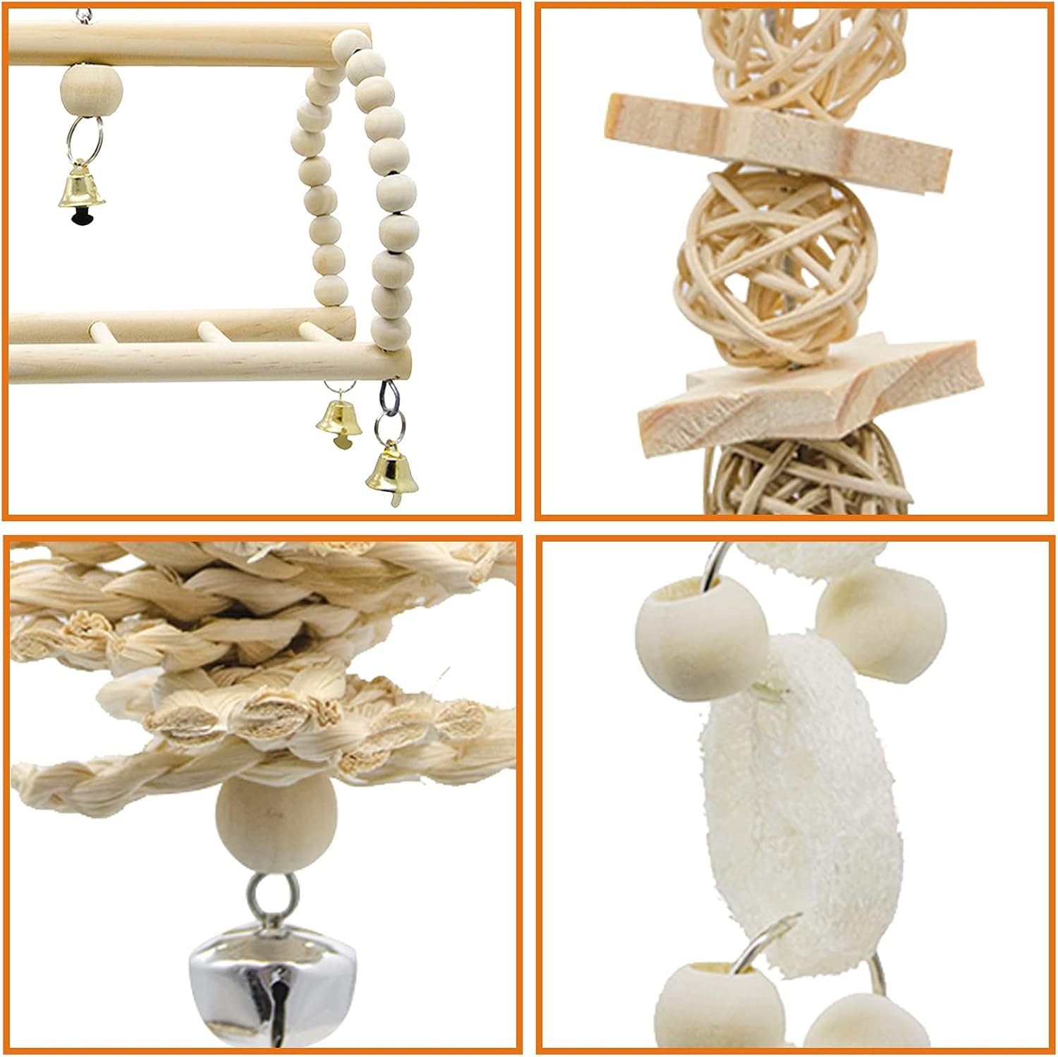 Deloky 7 Packs Bird Parrot Swing Chewing Toys are designed to provide a fun and elevated place for your birds to climb, chew, and explore. The package includes 7 pieces of different types of wooden bird entertaining toys arranged in multiple layers, suitable for small parakeets, cockatiels, conures, finches, budgie, macaws, parrots, and love birds.