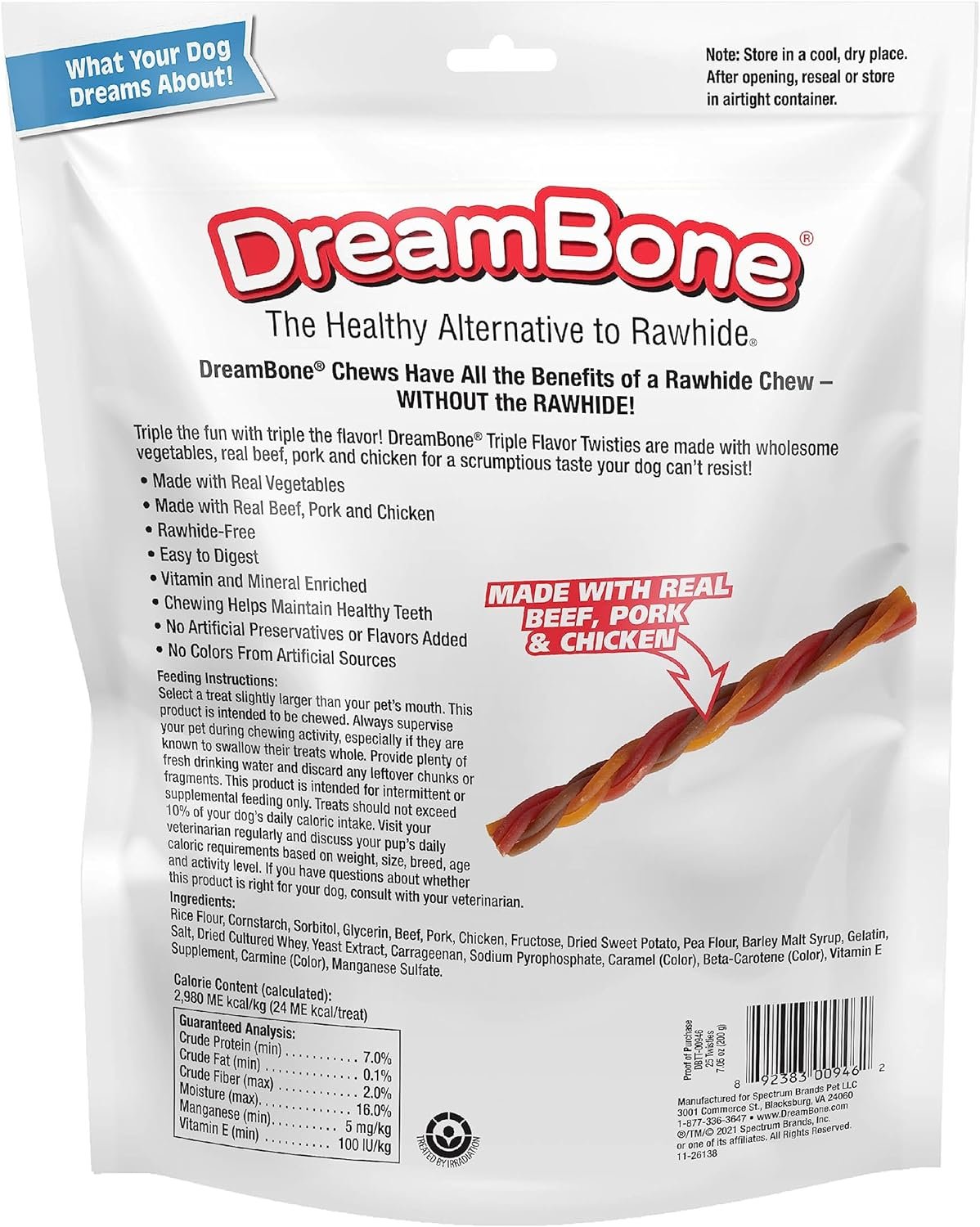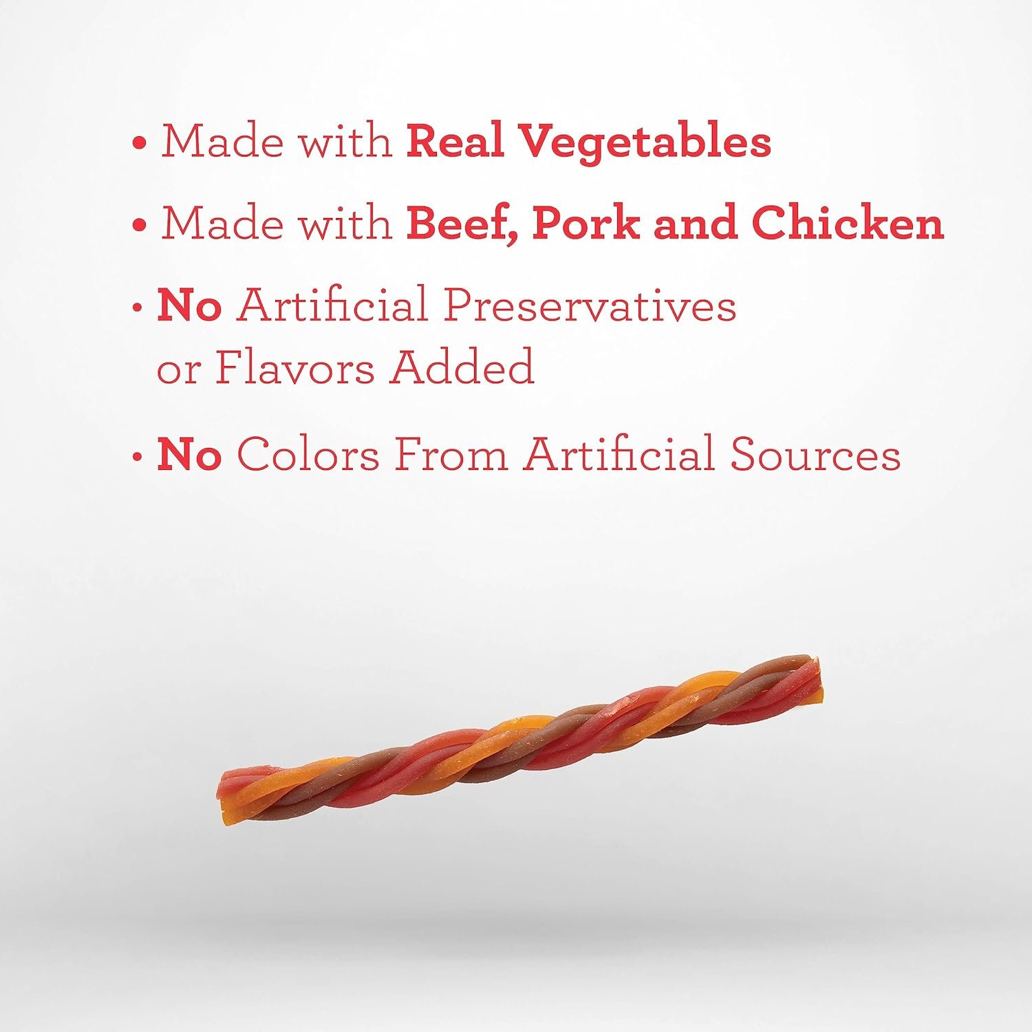 Made with wholesome vegetables, real beef, pork, and chicken, plus vitamin and mineral enriched, DreamBone Triple Flavor Twisties are a healthy alternative to rawhide with an irresistible taste dogs dream about. You’ll love that these easy-to-digest chews are made with no artificial preservatives or flavors added and no colors from artificial sources.