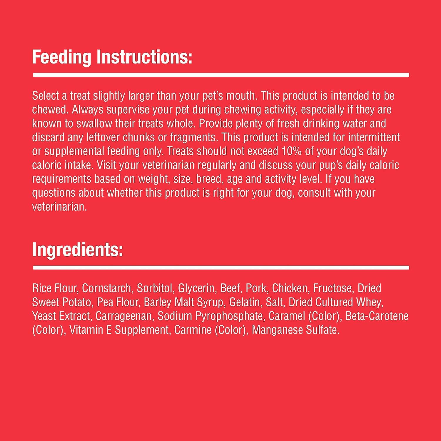 This product is intended to be chewed. Always supervise your pet during chewing activity, especially if they are known to swallow their treats whole. Provide plenty of fresh water and discard any leftover chunks or fragments. This product is intended for intermittent or supplemental feeding only. Treats should not exceed 10% of your dog’s daily caloric intake.