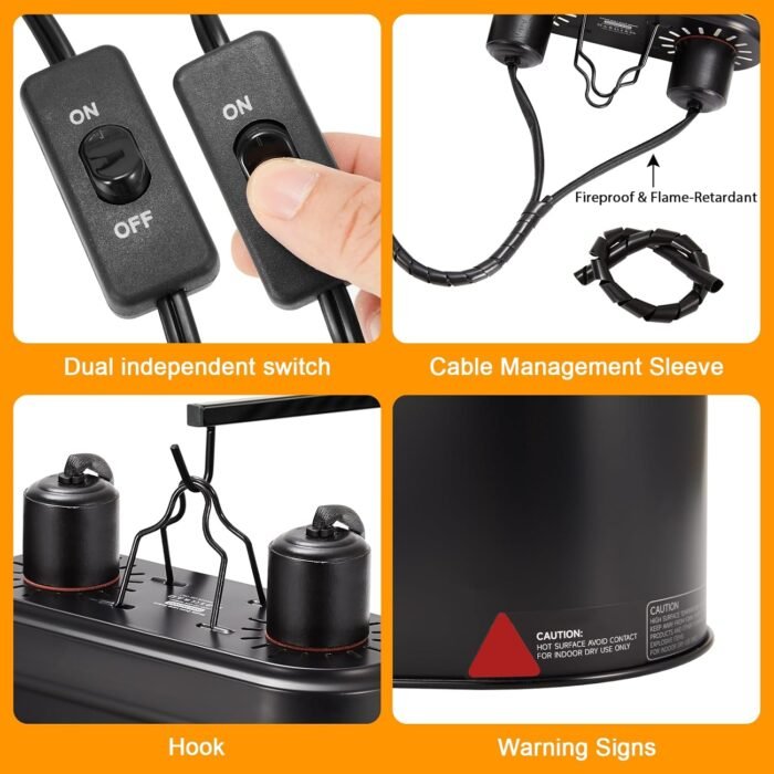 - Independent Switches: The power cord is equipped with two independent switches, allowing you to control the heat lamp and UVB lamp as needed