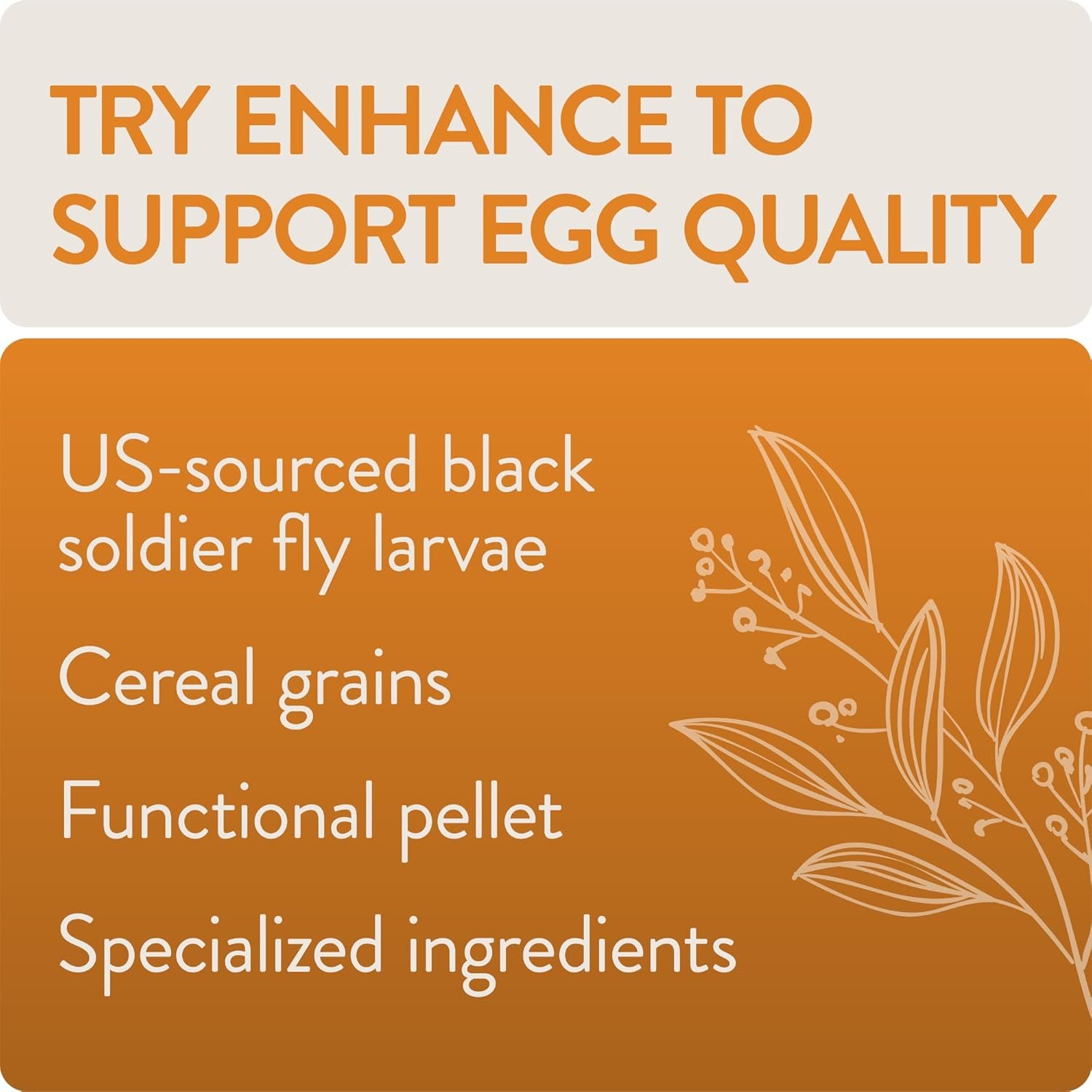 - Ingredients to Support Egg Quality: Enhance is made with Vitamin A rich marigold and carrot to enhance the egg yolk, omega-3 rich flaxseed to enrich the egg yolk, nutrient-enhancing enzymes, essential amino acids, and minerals.