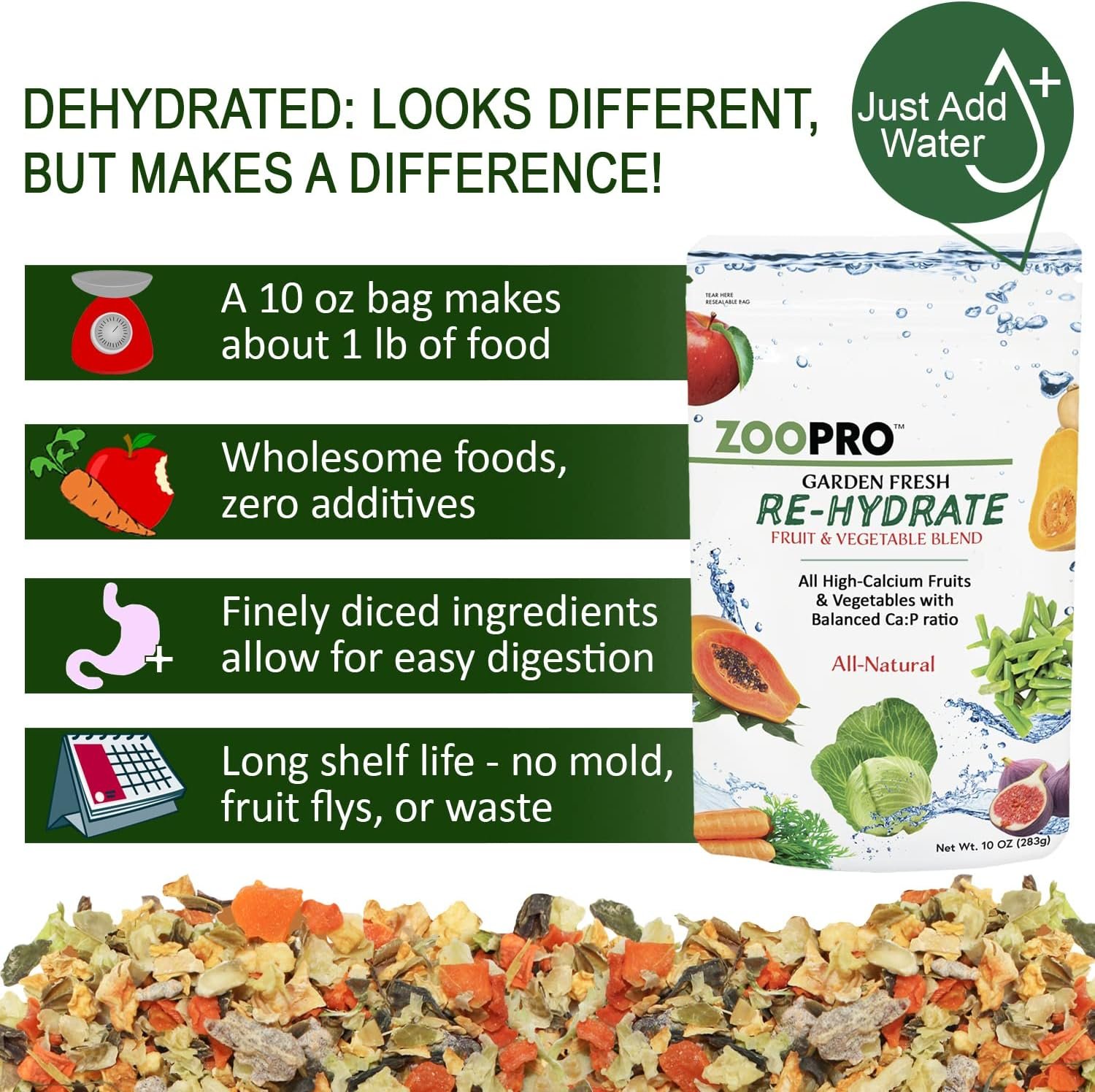 ZooPro’s Garden Fresh Re-Hydrate makes it easy to add a variety of healthy fruits and vegetables to your pet’s diet. This nutritious supplement is designed to provide a boost of essential nutrients and variety to the diet of small mammals, reptiles, and birds.