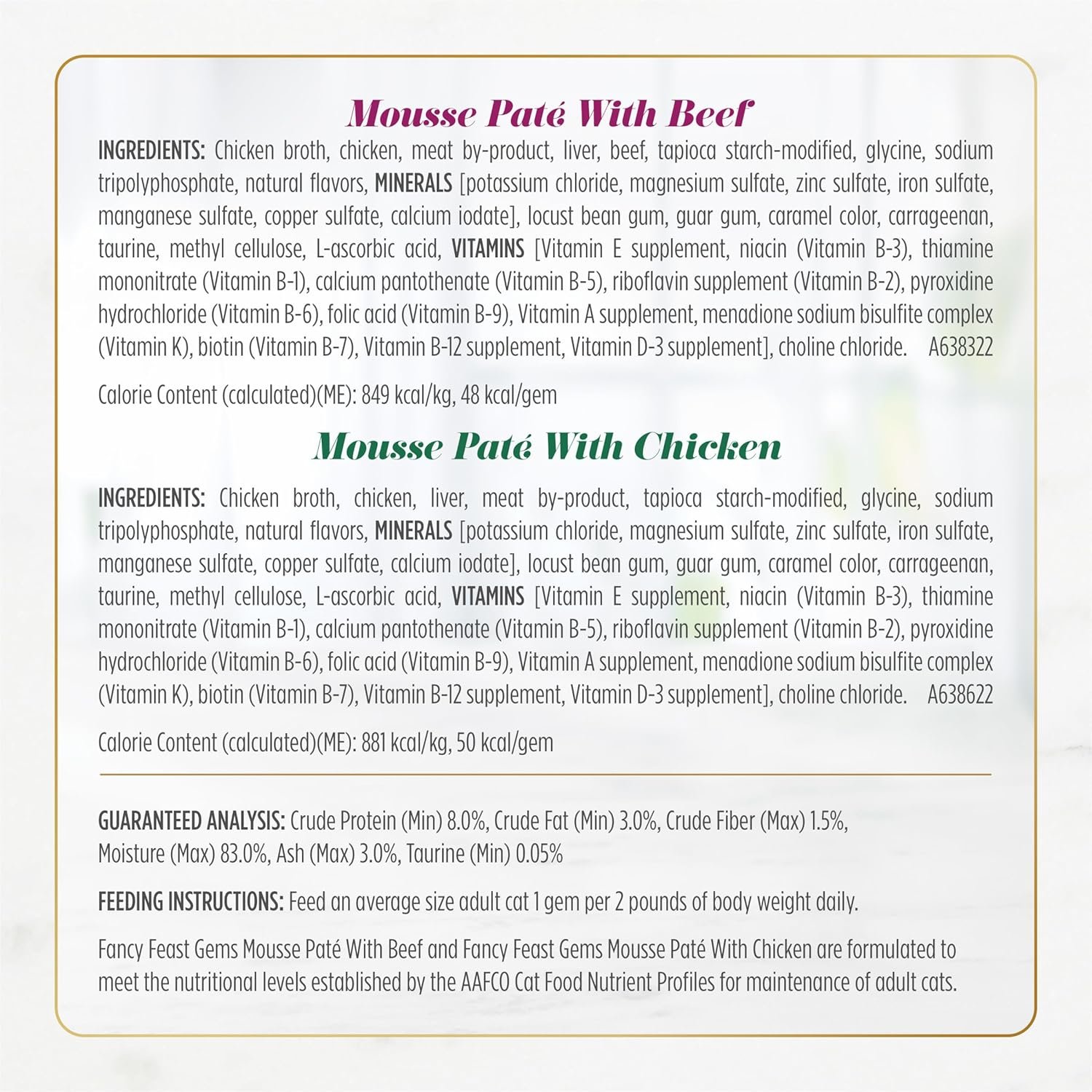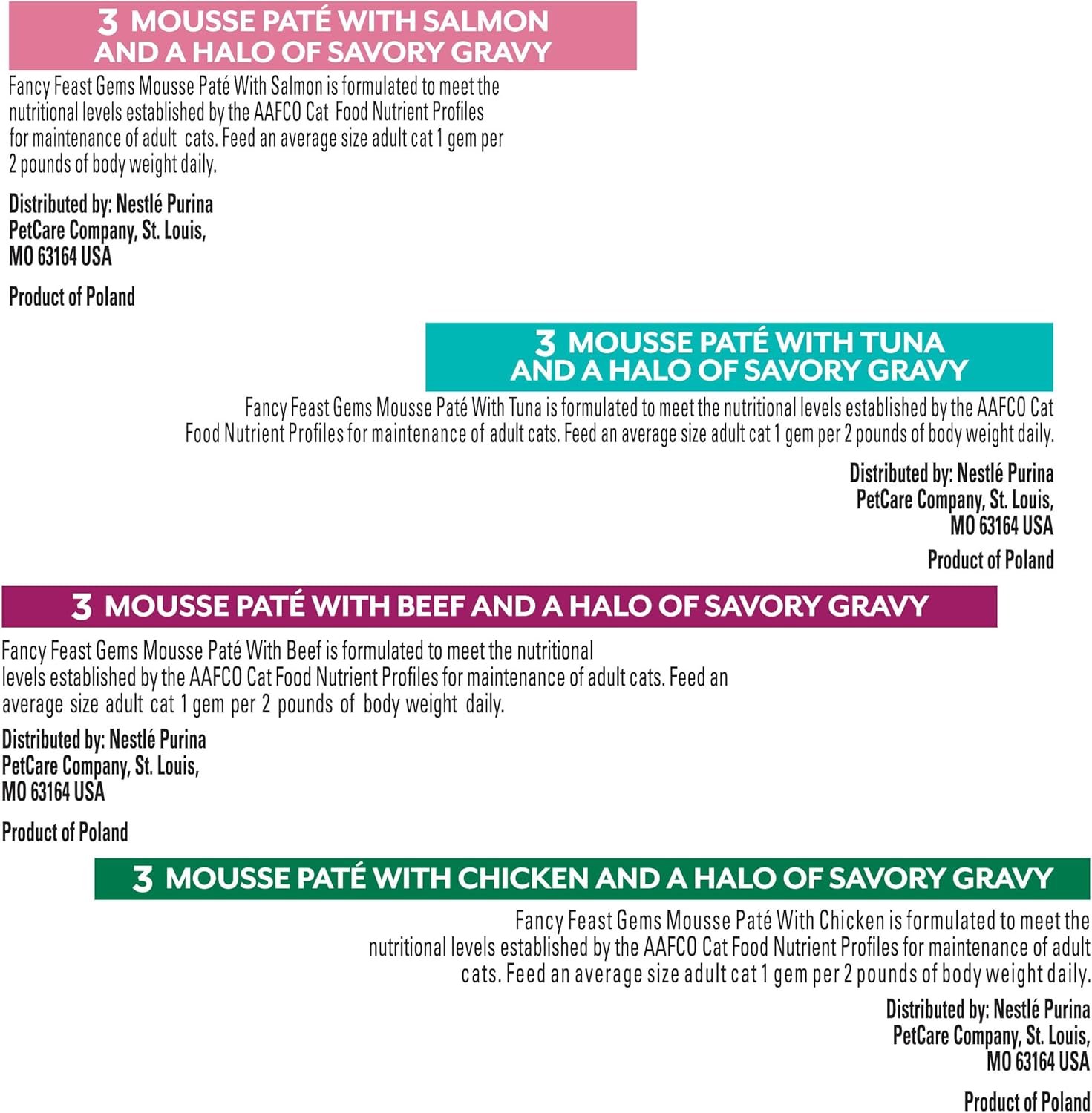 Fancy Feast Gems Mousse Pate Topped With Savory Gravy cat food Variety Pack offers a luxurious mealtime experience for cats. This mouthwatering mousse cat food is topped with wet cat food gravy, creating a cascade of savory cat gravy that transforms mealtime into a marvelous experience. Crafted with high-quality beef, chicken, salmon, or tuna, this pate wet cat food is in a pyramid-shaped cat pate that makes eating delightful for cats.