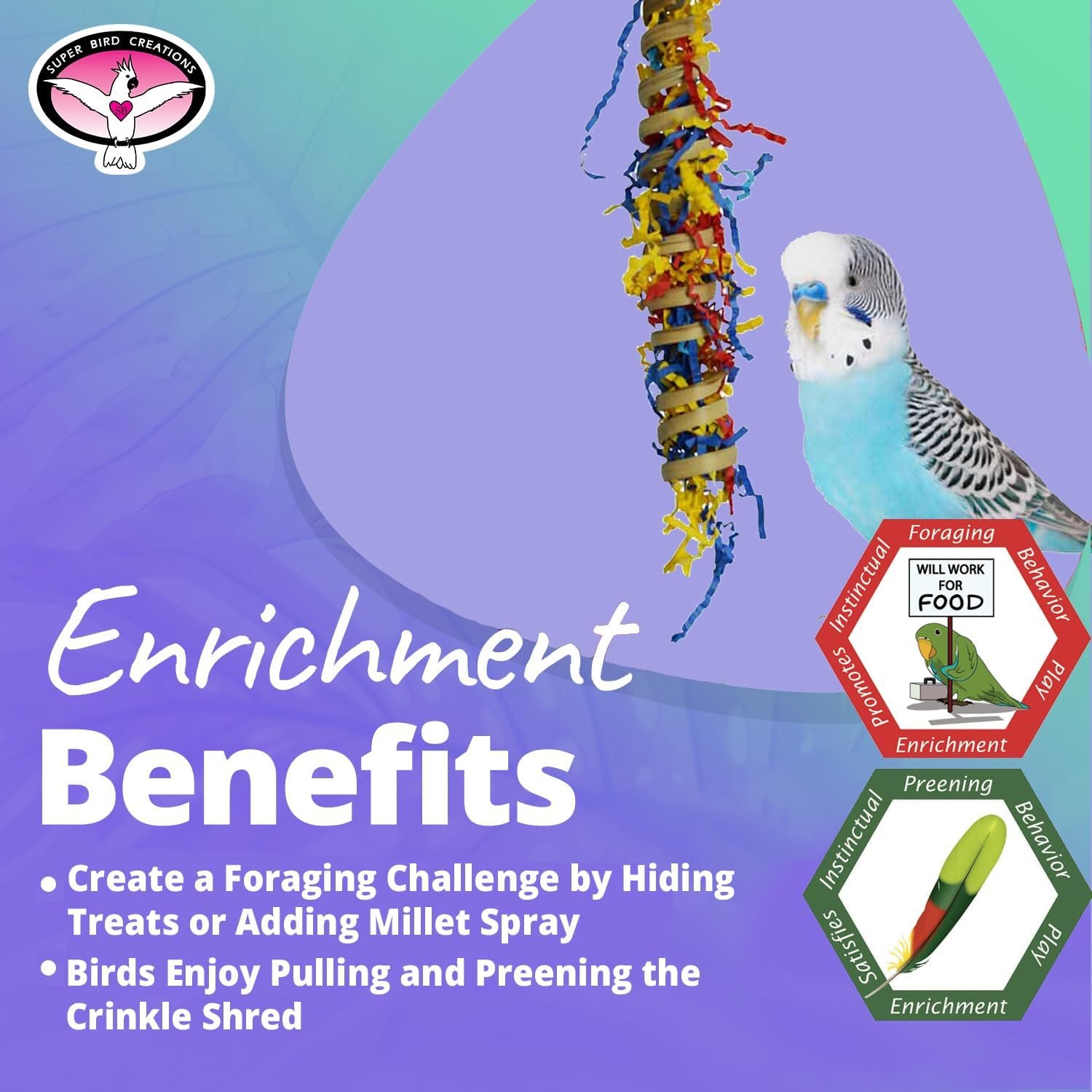 Our bird toys designated for small pet birds are suitable for birds including budgies, lovebirds, parakeets, parrotlets, small conures, and cockatiels. Even finches and canaries will enjoy toys with shiny bells, swings, and preening features. Since 1992, Super Bird Creations has been focused on designing bird toys and products to address the instinctual needs of pet birds, helping to ward off boredom, depression, aggression, and destructive behaviors by stimulating physical activity, curiosity, and mental engagement.