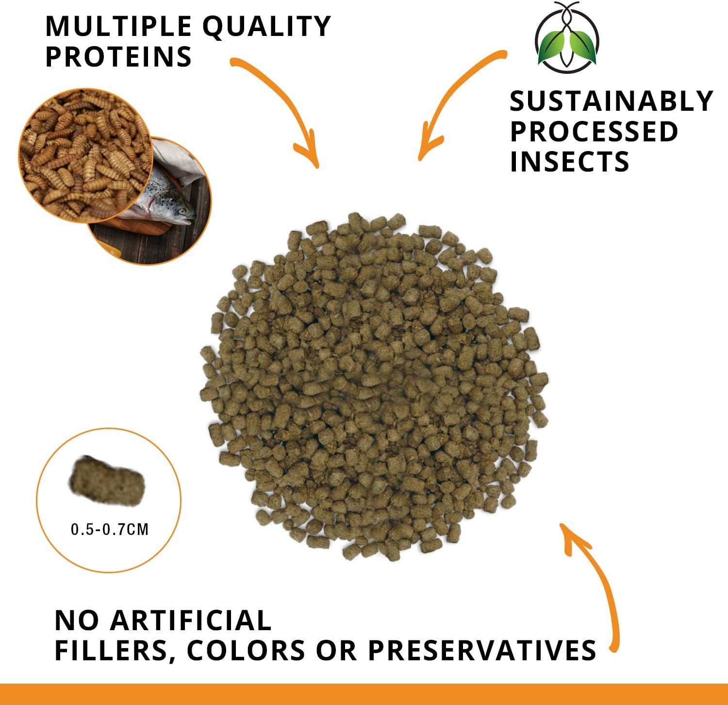 - High-quality protein sources, including Black Soldier Fly Larvae and whole salmon, support healthy skin, scales, and fins