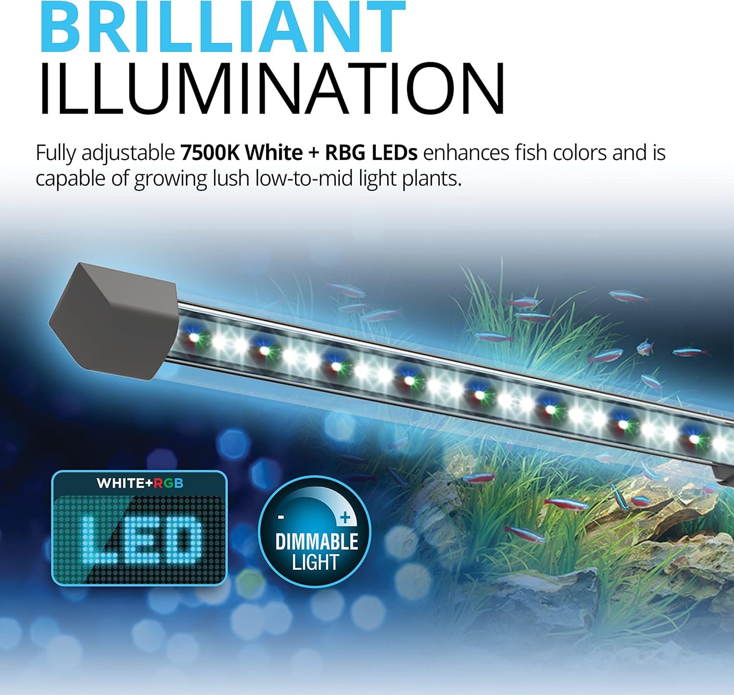 • Customizable LED aquarium lights with fully adjustable 7500K White + RGB LEDs for endless color blends and plant growth support